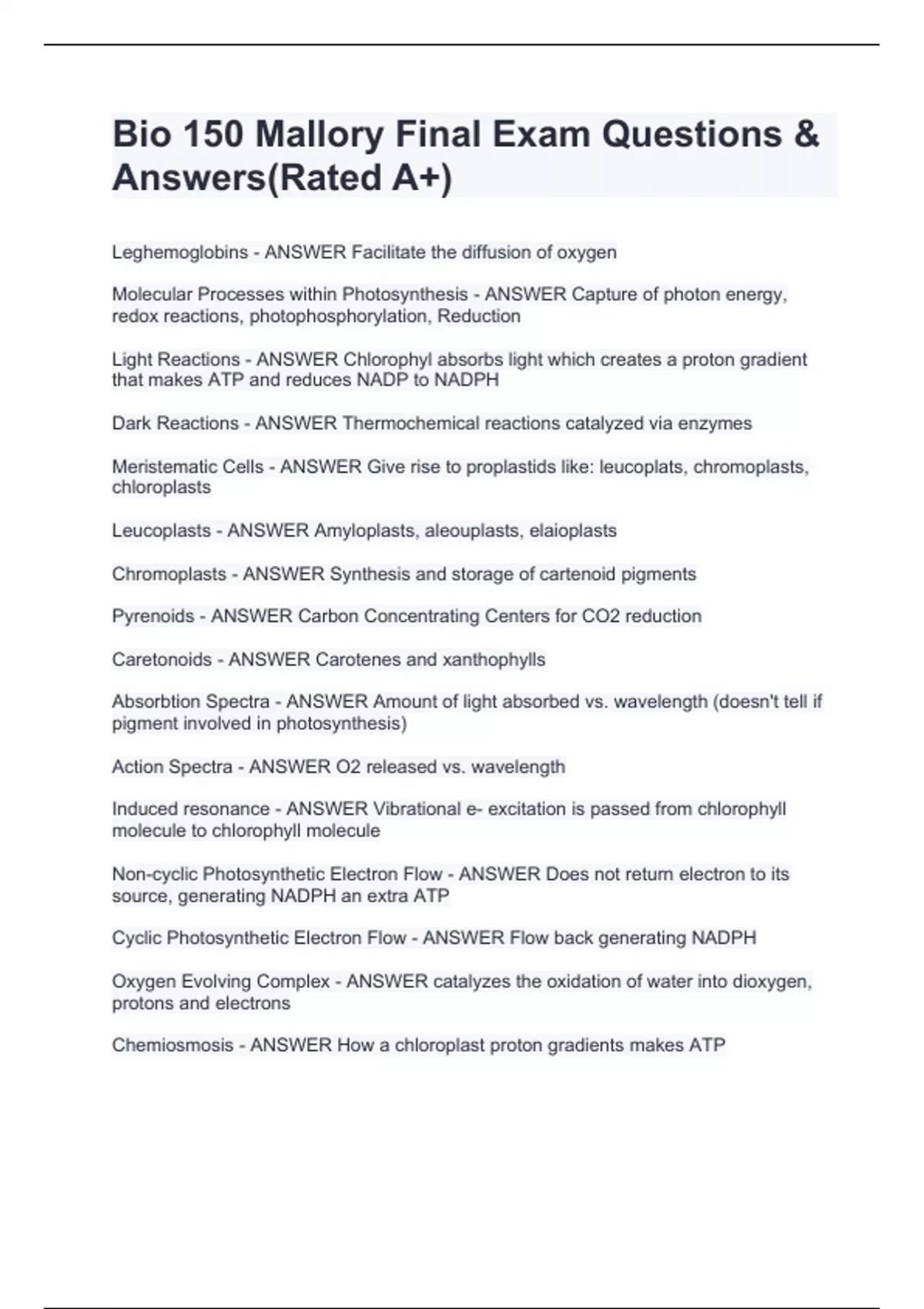 Bio 150 Mallory Final Exam Questions & An Leghemoglobins - ANSWER Facilitate the diffusion of oxygen Molecular Processes within Photosynthesis - ANSWER Capture of photon energy, redox reactions, photophosphorylation, Reduction Light Reactions - ANSWER Chlorophyl absorbs light which creates a proton gradient that makes ATP and reduces NADP to NADPH Dark Reactions - ANSWER Thermochemical reactions catalyzed via enzymes Meristematic Cells - ANSWER Give rise to proplastids like: leucoplats, chromoplasts, chloroplasts Leucoplasts - ANSWER Amyloplasts, aleouplasts, elaioplasts Chromoplasts - ANSWER Synthesis and storage of cartenoid pigments Pyrenoids - ANSWER Carbon Concentrating Centers for CO2 reduction Caretonoids - ANSWER Carotenes and xanthophylls Absorbtion Spectra - ANSWER Amount of light absorbed vs. wavelength (doesn't tell if pigment involved in photosynthesis) Action Spectra - ANSWER O2 released vs. wavelength Induced resonance - ANSWER Vibrational e- excitation is passed from chlorophyll swers(Rated A+)
