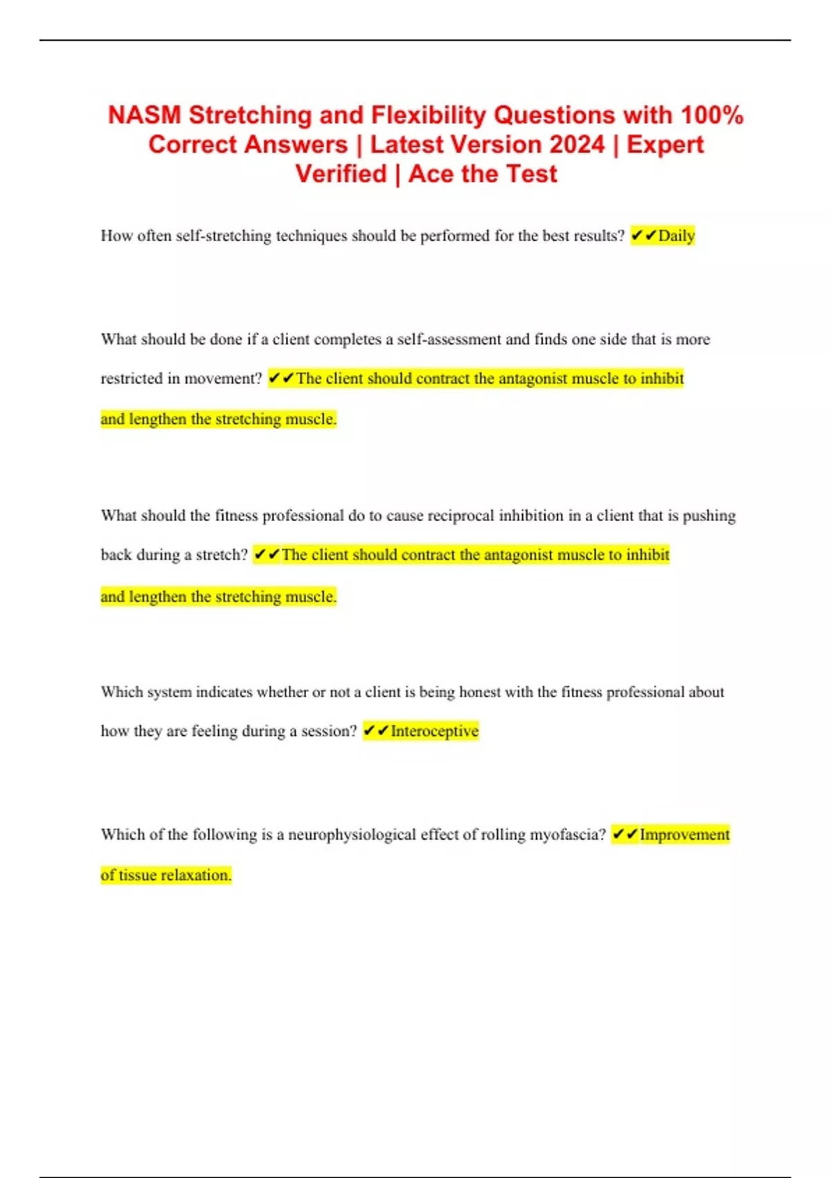 NASM Stretching and Flexibility Questions with 100% Correct Answers | Latest Version 2024 | Expert Verified | Ace the Test