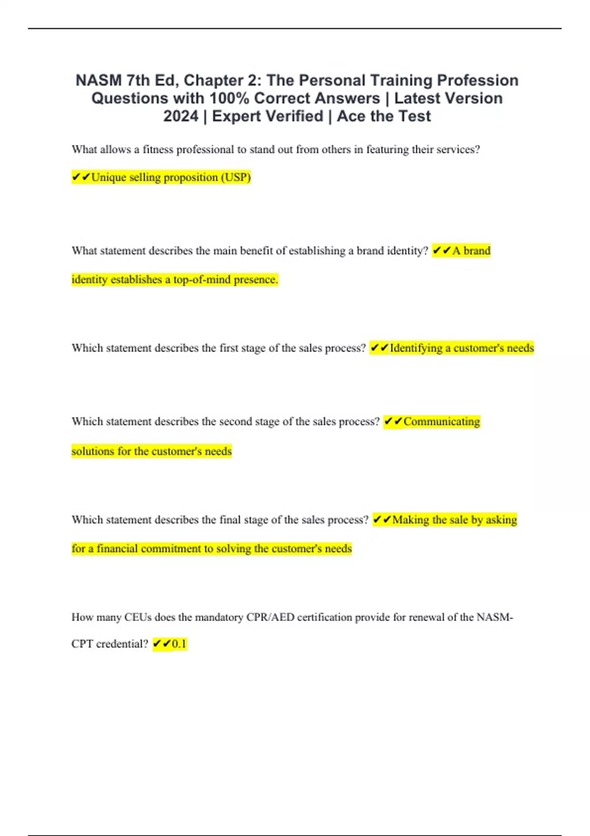 NASM 7th Ed, Chapter 2: The Personal Training Profession Questions with 100% Correct Answers | Latest Version 2024 | Expert Verified | Ace the Test