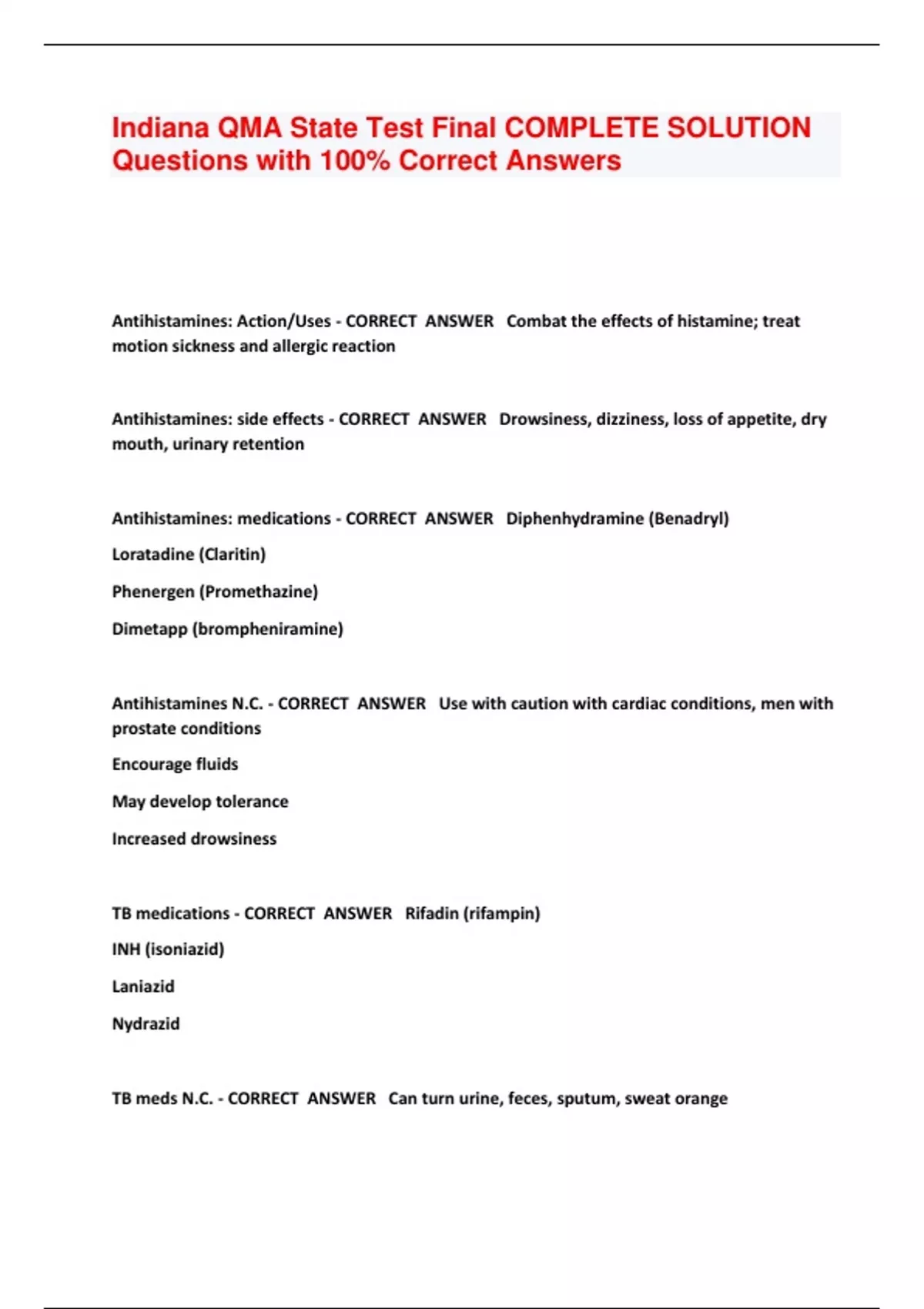 Indiana QMA State Test Final COMPLETE SOLUTION Questions with 100% Correct Answers Antihistamines: Action/Uses - CORRECT ANSWER Combat the effects of histamine; treat motion sickness and allergic reaction Antihistamines: side effects - CORRECT ANSWER Drowsiness, dizziness, loss of appetite, dry mouth, urinary retention Antihistamines: medications - CORRECT ANSWER Diphenhydramine (Benadryl) Loratadine (Claritin) Phenergen (Promethazine) Dimetapp (brompheniramine) Antihistamines N.C. - CORRECT ANSWER Use with caution with cardiac conditions, men with prostate conditions Encourage fluids May develop tolerance Increased drowsiness TB medications - CORRECT ANSWER Rifadin (rifampin) INH (isoniazid) Laniazid Nydrazid TB meds N.C. - CORRECT ANSWER Can turn urine, feces, sputum, sweat orange Use with caution for residents with acoholism and liver disease Monitor for signs of hepatitis and weight loss give with food Store in light resistant container TB meds: action/uses - CORRECT ANSWER Reduce/kill growth of the bacteria that causes TB Treat active disease TB side effects - C