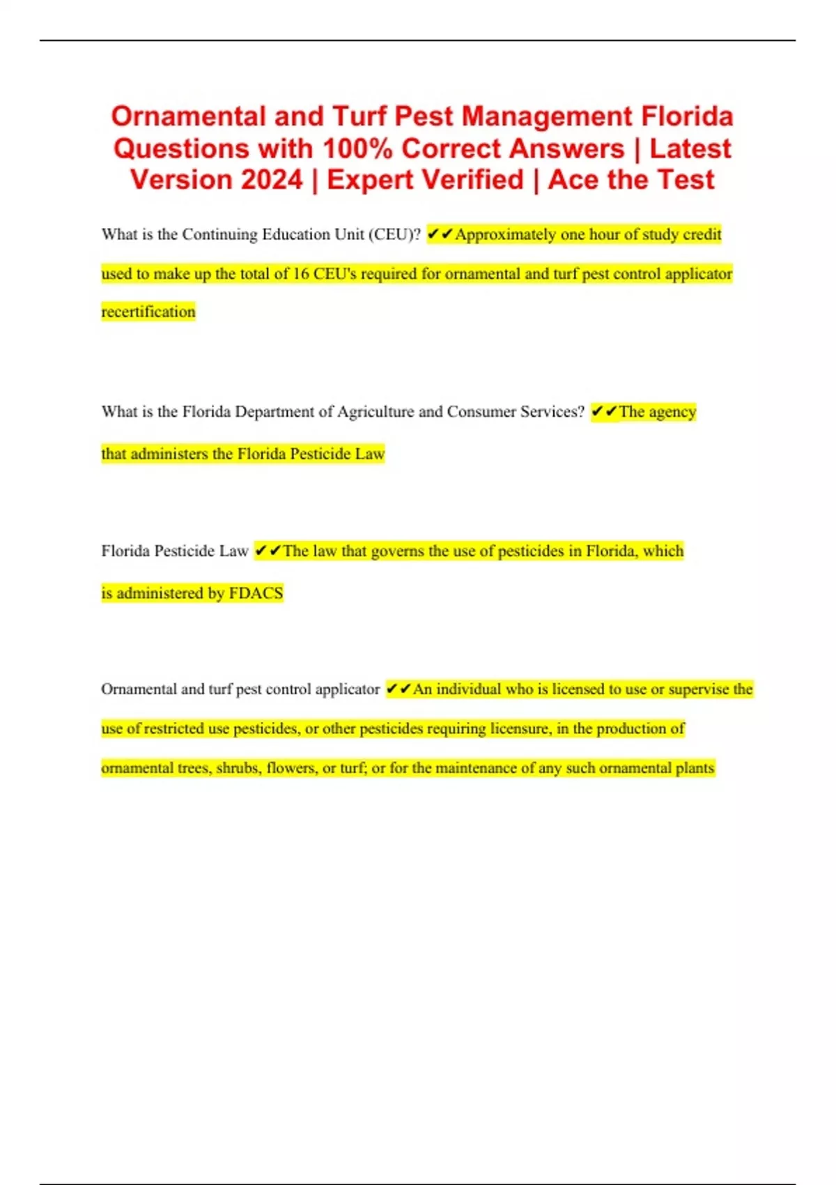 Ornamental and Turf Pest Management Florida Questions with 100% Correct Answers | Latest Version 2024 | Expert Verified | Ace the Test