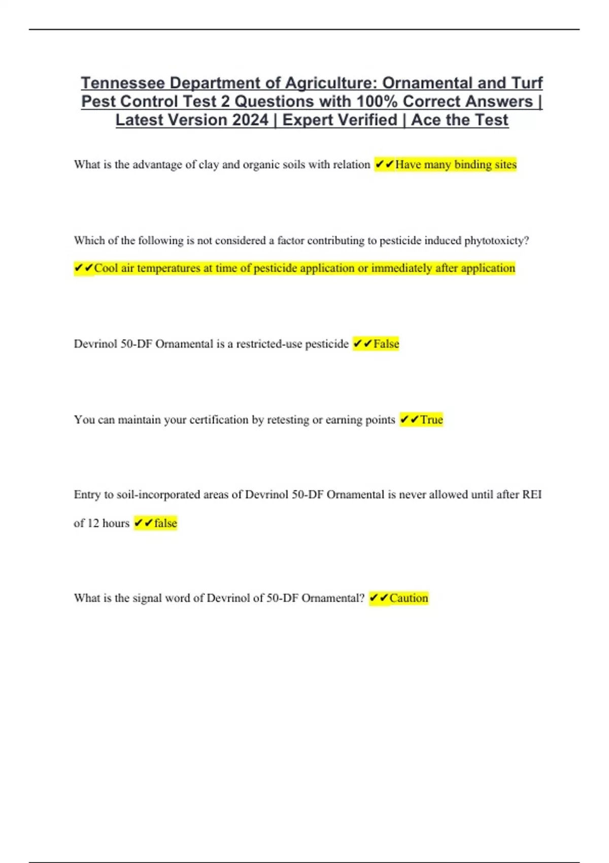 Tennessee Department of Agriculture: Ornamental and Turf Pest Control Test 2 Questions with 100% Correct Answers | Latest Version 2024 | Expert Verified | Ace the Test