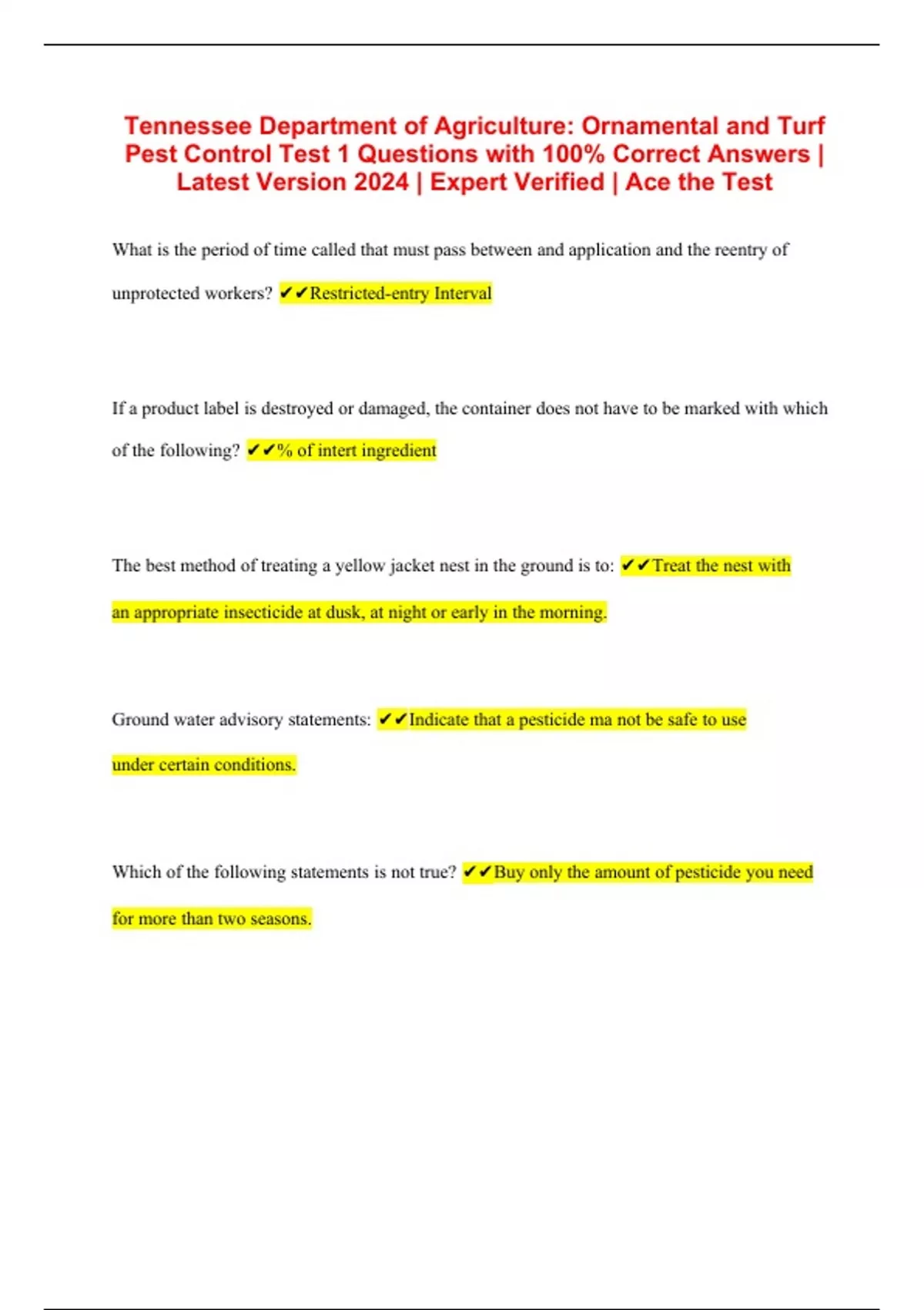 Tennessee Department of Agriculture: Ornamental and Turf Pest Control Test 1 Questions with 100% Correct Answers | Latest Version 2024 | Expert Verified | Ace the Test