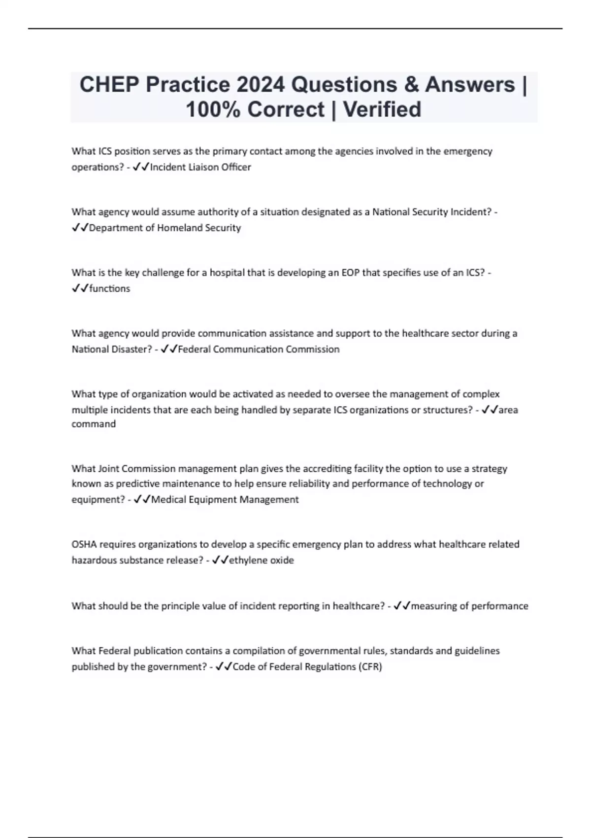 CHEP Practice 2024 Questions & Answers | 100% Correct | Verified