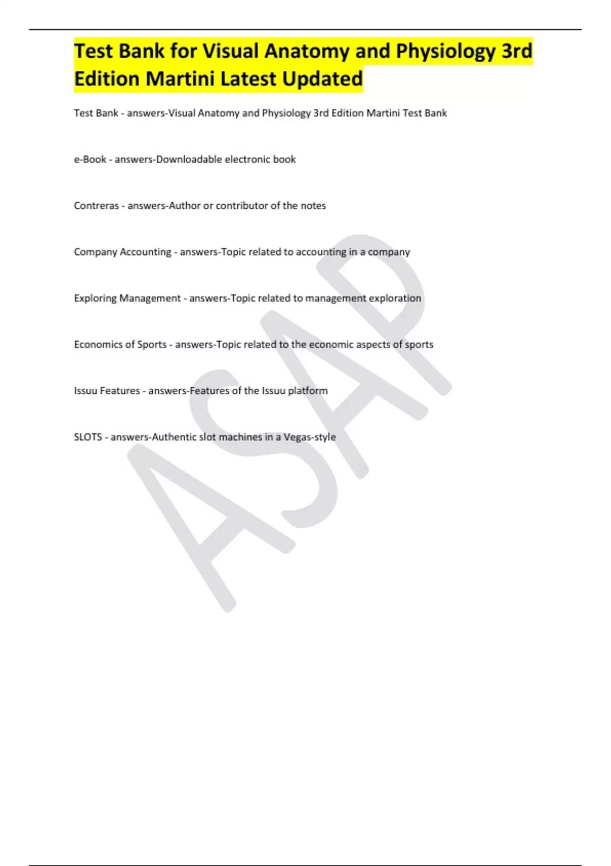 Test Bank for Visual Anatomy and Physiology 3rd Edition Martini Latest Updated Test Bank - answers-Visual Anatomy and Physiology 3rd Edition Martini Test Bank e-Book - answers-Downloadable electronic book Contreras - answers-Author or contributor of the notes