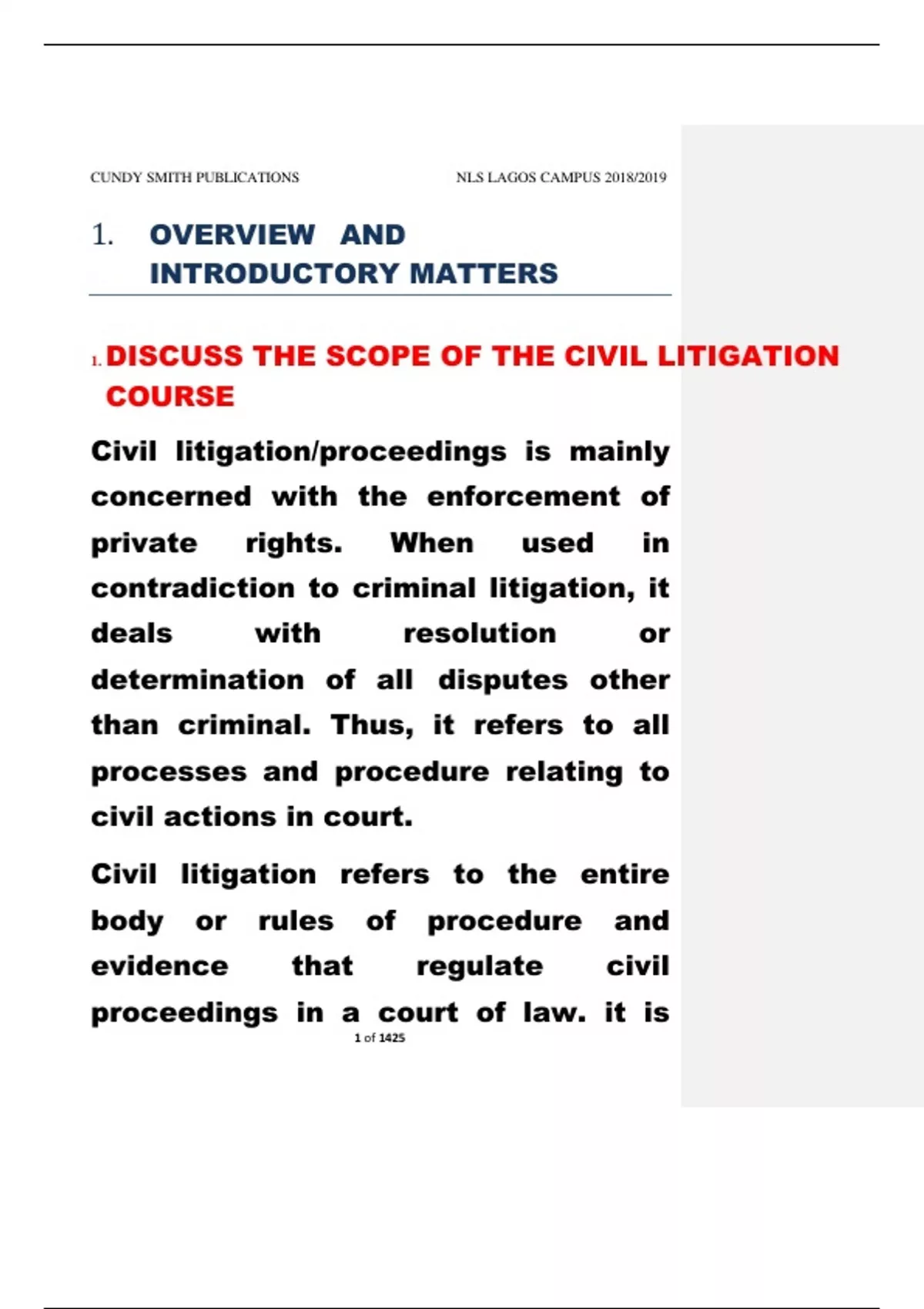 1. OVERVIEW AND INTRODUCTORY MATTERS 1.DISCUSS THE SCOPE OF THE CIVIL LITIGATION COURSE Civil litigation/proceedings is mainly concerned with the enforcement of private rights. When used in contradiction to criminal litigation, it deals with resolutio