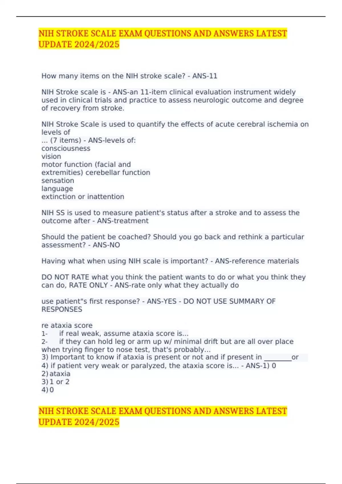 NIH STROKE SCALE EXAM QUESTIONS AND ANSWERS LATEST UPDATE 2024/2025