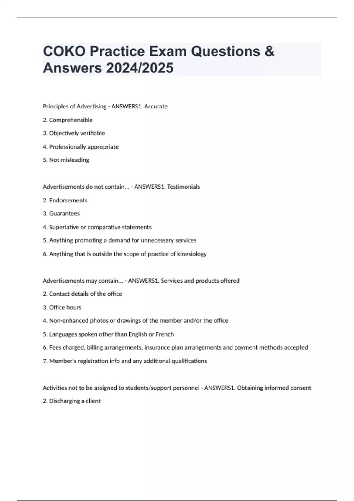 COKO Practice Exam Questions & Answers 2024/2025 Principles of Advertising - ANSWERS1. Accurate 2. Comprehensible 3. Objectively verifiable 4. Professionally appropriate 5. Not misleading Advertisements do not contain... - ANSWERS1. Testimonials 2. Endorsements 3. Guarantees 4. Superlative or comparative statements 5. Anything promoting a demand for unnecessary services 6. Anything that is outside the scope of practice of kinesiology Advertisements may contain... - ANSWERS1. Services and products offered 2. Contact details of the office 3. Office hours 4. Non-enhanced photos or drawings of the member and/or the office 5. Languages spoken other than English or French 6. Fees charged, billing arrangements, insurance plan arrangements and payment methods accepted 7. Member's registration info and any additional qualifications Activities not to be assigned to students/support personnel - ANSWERS1. Obtaining informed consent 2. Discharging a client