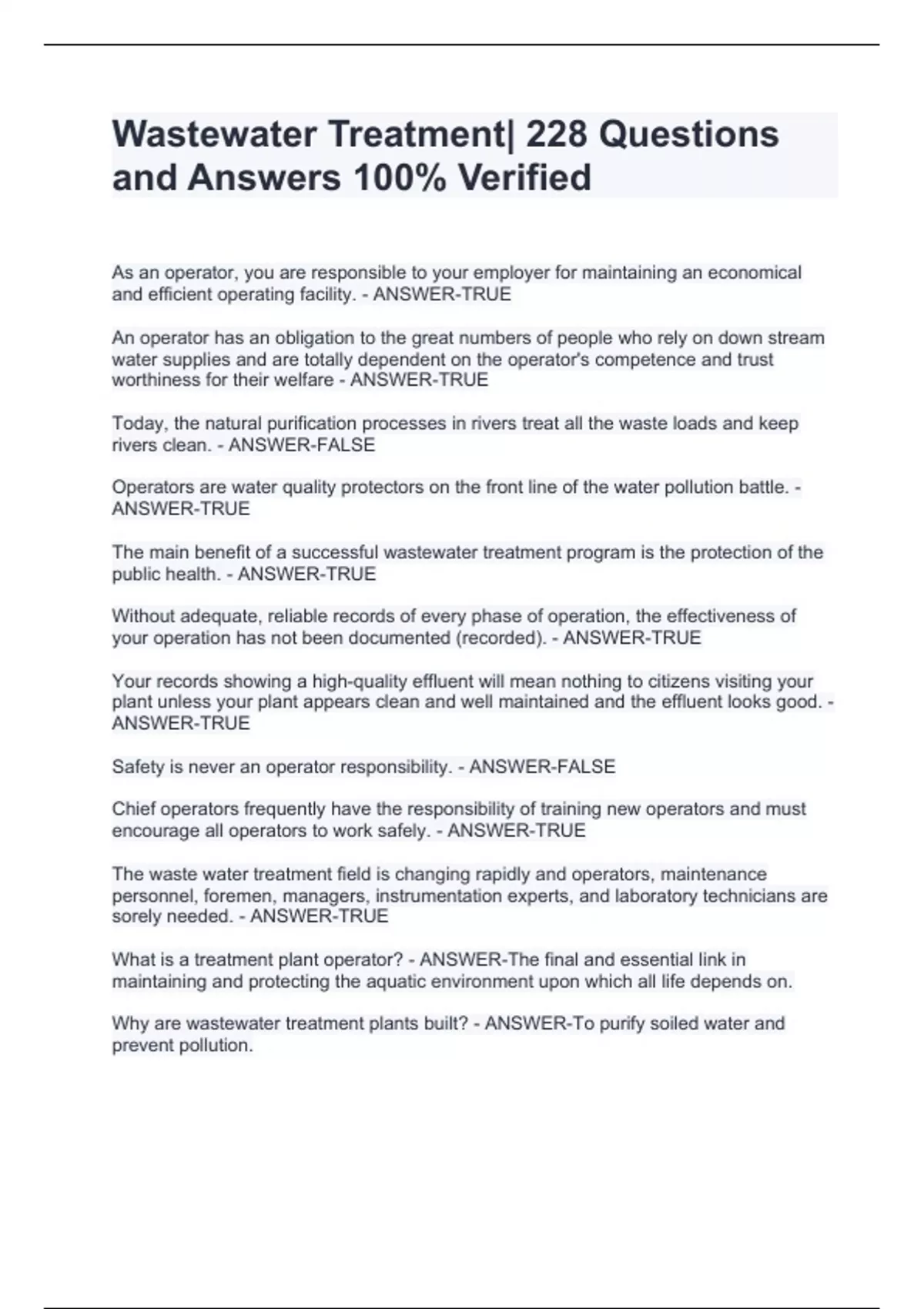 Wastewater Treatment| 228 Questions and Answers 100% Verified