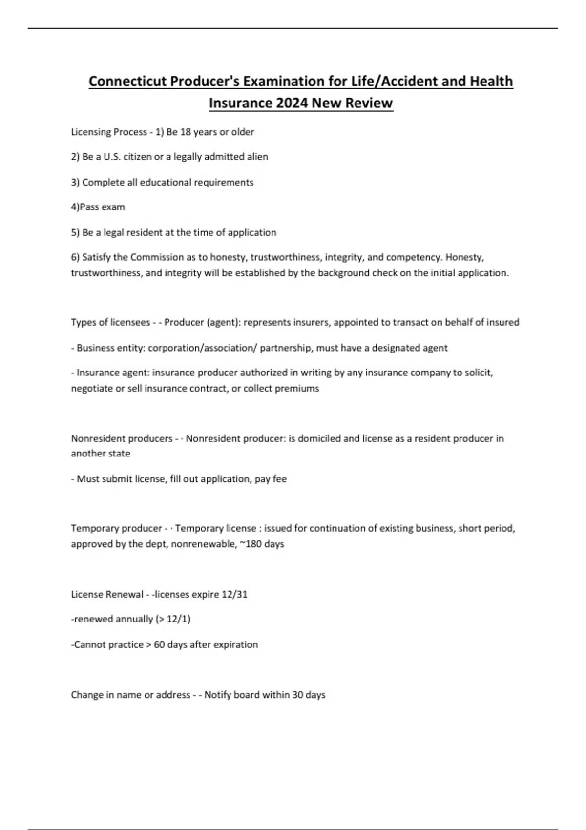 Connecticut Producer's Examination for Life/Accident and Health Insurance 2024 New Review Licensing Process - 1) Be 18 years or older 2) Be a U.S. citizen or a legally admitted alien 3) Complete all educational requirements 4)Pass exam 5) Be a legal resident at the time of application 6) Satisfy the Commission as to honesty, trustworthiness, integrity, and competency. Honesty, trustworthiness, and integrity will be established by the background check on the initial application. Types of licensees - - Producer (agent): represents insurers, appointed to transact on behalf of insured - Business entity: corporation/association/ partnership, must have a designated agent - Insurance agent: insurance producer authorized in writing by any insurance company to solicit, negotiate or sell insurance contract, or collect premiums Nonresident producers - · Nonresident producer: is domiciled and license as a resident producer in another state - Must submit license, fill out application, pay fee Temporary producer - · Temporary license : issued for continuation of existing business, short period, approved by the dept, nonrenewable, ~180 days License Renewal - -licenses expire 12/31 -renewed annually (> 12/1) -Cannot practice > 60 days after expiration Change in name or address - - Notify board within 30 days - producer must maintain proof of notice on file for 5 years Reporting of actions - A licensee must report any administrative action taken against him in another jurisdiction or state within 30 days of the final disposition of the matter. The report, filed with the Superintendent must include a copy of any relevant legal documents. 500.00 fine if not. no minor traffic infractions Assumed names - producers must only use their legal names...no aliases Continuing education requirements, exemptions, and penalties - - Must be renewed every 2 years - Continuing education- must be completed every reporting period - License is not required if a person does not receive commissions Disciplinary actions - - Disciplinary actions; § License denial, suspension, revocation or refusal to renew § Cease and desist order § Monetary fines Cease and desist order - issued by the commissioner to stop producing insurance due to illegal activity (may be issued before a hearing) Hearings - sessions held by committees or subcommittees to gather information and views from experts Suspensions, revocations, refusal to issue or renew, fines - -Any licensee who neglects or fails to satisfy continuing education requirements will be subject to license suspension until compliance Commissioner's general duties and powers - -