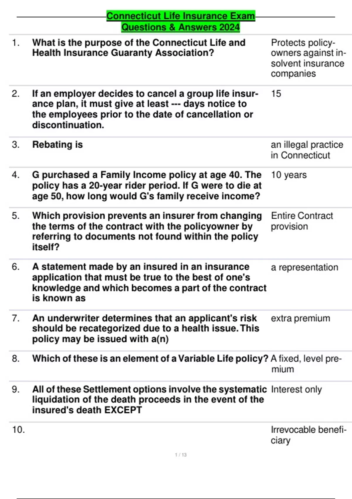 Connecticut Life Insurance Exam Questions & Answers 2024 1. What is the purpose of the Connecticut Life and Health Insurance Guaranty Association? 2. If an employer decides to cancel a group life insurance plan, it must give at least --- days notice to the employees prior to the date of cancellation or discontinuation. 3. Rebating is 4. G purchased a Family Income policy at age 40. The policy has a 20-year rider period. If G were to die at age 50, how long would G's family receive income?