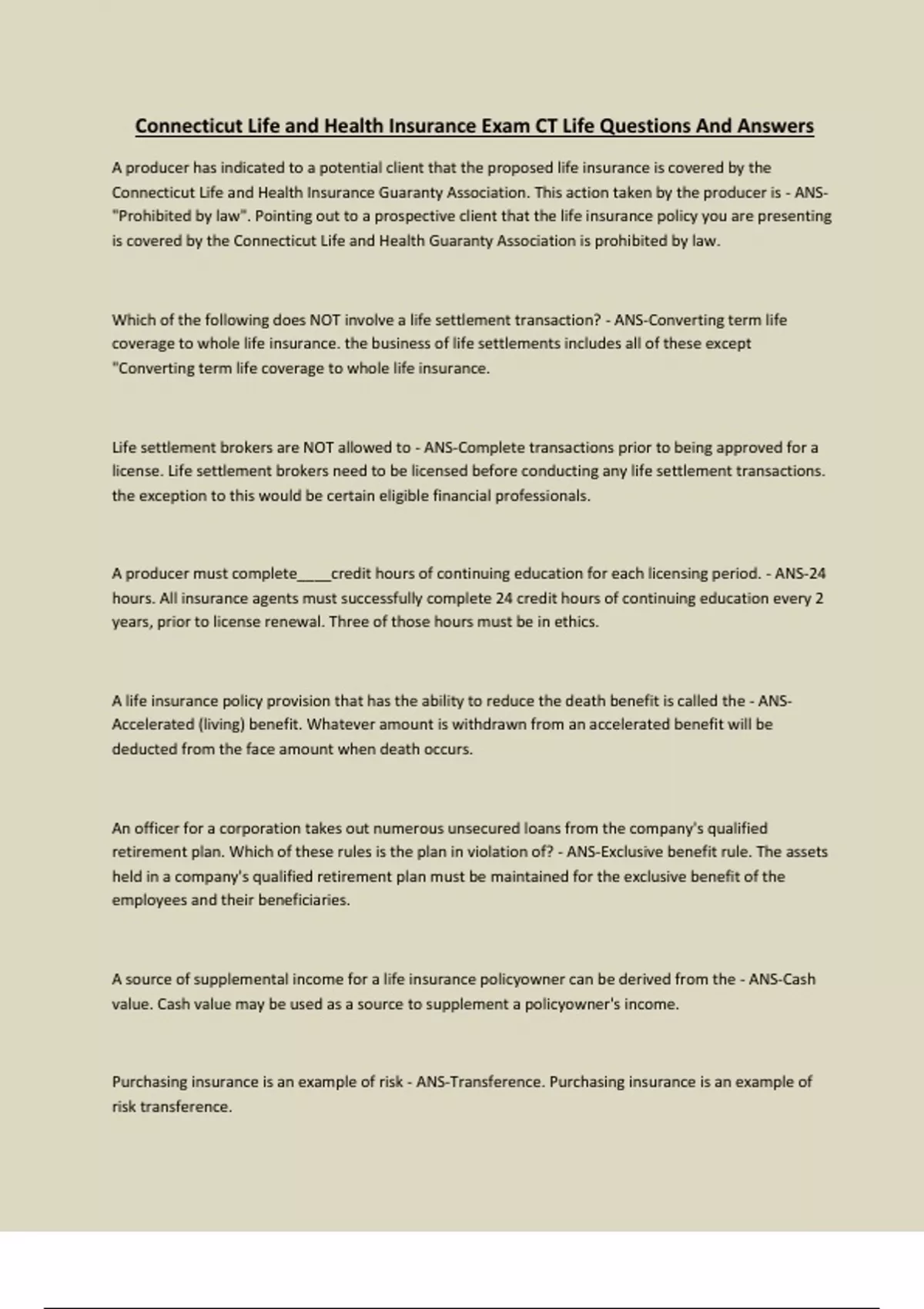 Connecticut Life and Health Insurance Exam CT Life Questions And Answers A producer has indicated to a potential client that the proposed life insurance is covered by the Connecticut Life and Health Insurance Guaranty Association. This action taken by the producer is - ANS- "Prohibited by law". Pointing out to a prospective client that the life insurance policy you are presenting is covered by the Connecticut Life and Health Guaranty Association is prohibited by law. Which of the following does NOT involve a life settlement transaction? - ANS-Converting term life coverage to whole life insurance. the business of life settlements includes all of these except "Converting term life coverage to whole life insurance. Life settlement brokers are NOT allowed to - ANS-Complete transactions prior to being approved for a license. Life settlement brokers need to be licensed before conducting any life settlement transactions. the exception to this would be certain eligible financial professionals. A producer must complete____credit hours of continuing education for each licensing period. - ANS-24 hours. All insurance agents must successfully complete 24 credit hours of continuing education every 2 years, prior to license renewal. Three of those hours must be in ethics. A life insurance policy provision that has the ability to reduce the death benefit is called the - ANSAccelerated (living) benefit. Whatever amount is withdrawn from an accelerated benefit will be deducted from the face amount when death occurs. An officer for a corporation takes out numerous unsecured loans from the company's qualified retirement plan. Which of these rules is the plan in violation of? - ANS-Exclusive benefit rule. The assets held in a company's qualified retirement plan must be maintained for the exclusive benefit of the employees and their beneficiaries. A source of supplemental income for a life insurance policyowner can be derived from the - ANS-Cash value. Cash value may be used as a source to supplement a policyowner's income. Purchasing insurance is an example of risk - ANS-Transference. Purchasing insurance is an example of risk transference. Which statement best describes a single premium whole life policy? - ANS...