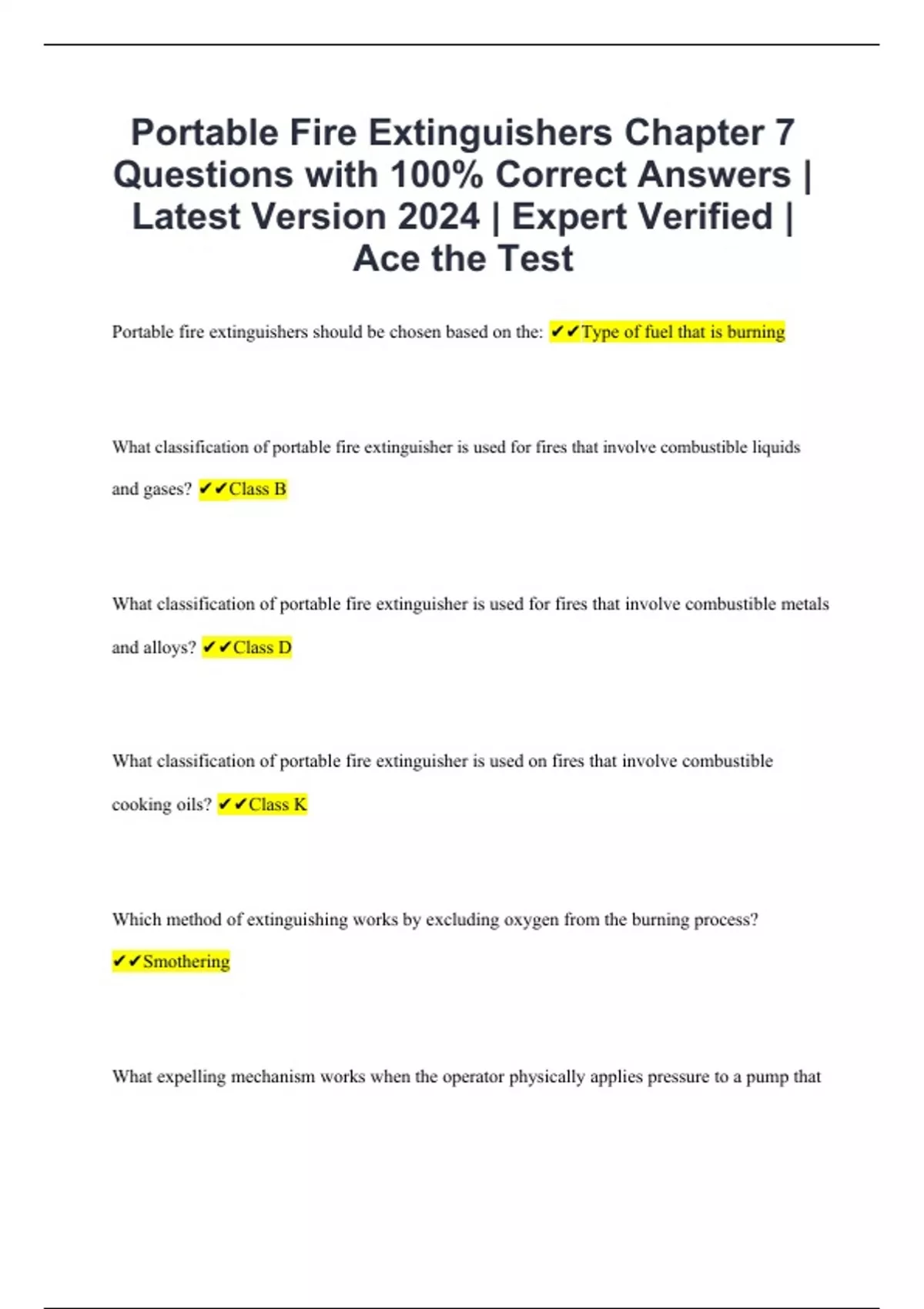 Portable Fire Extinguishers Chapter 7 Questions with 100% Correct Answers | Latest Version 2024 | Expert Verified | Ace the Test