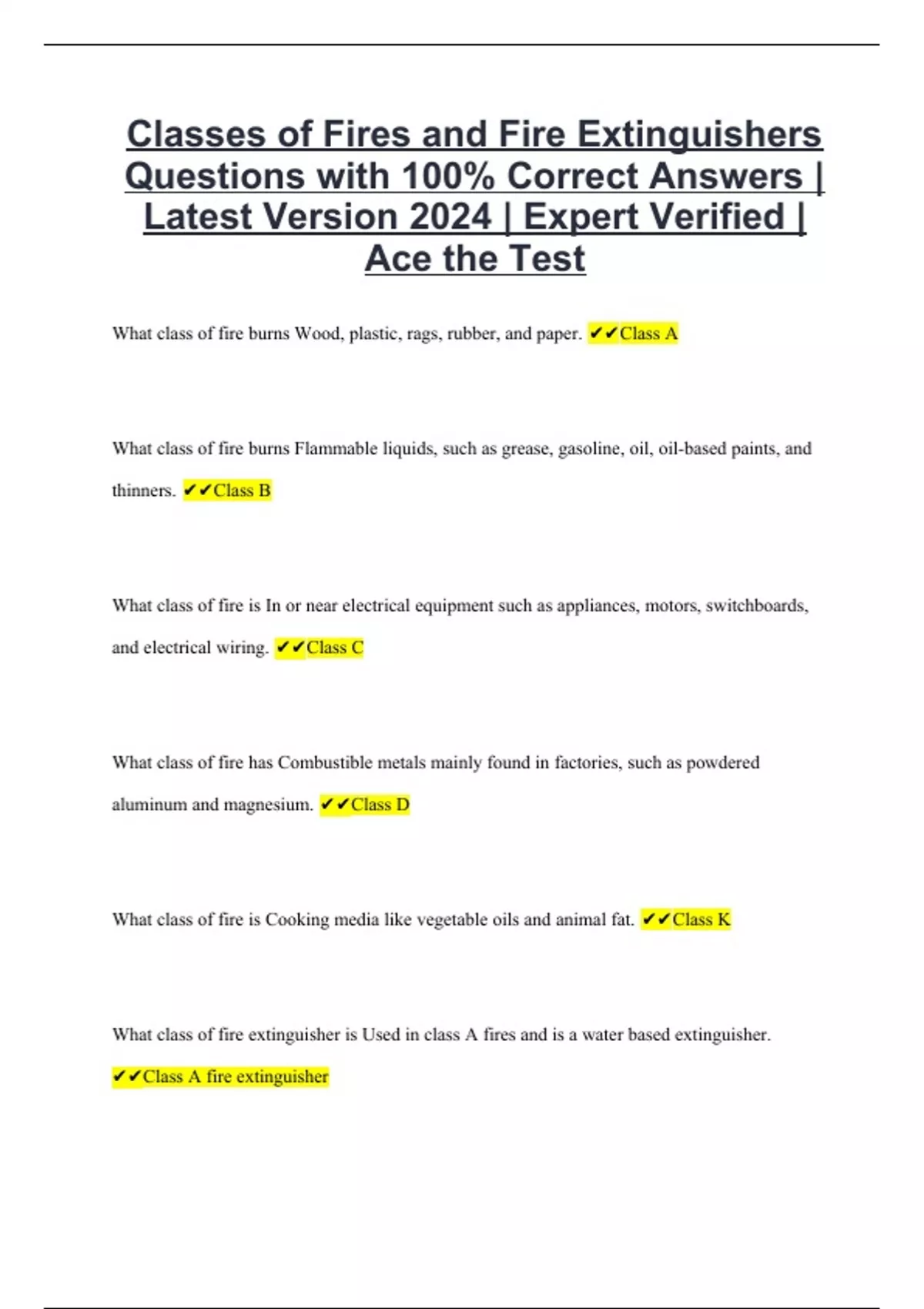 Classes of Fires and Fire Extinguishers Questions with 100% Correct Answers | Latest Version 2024 | Expert Verified | Ace the Test