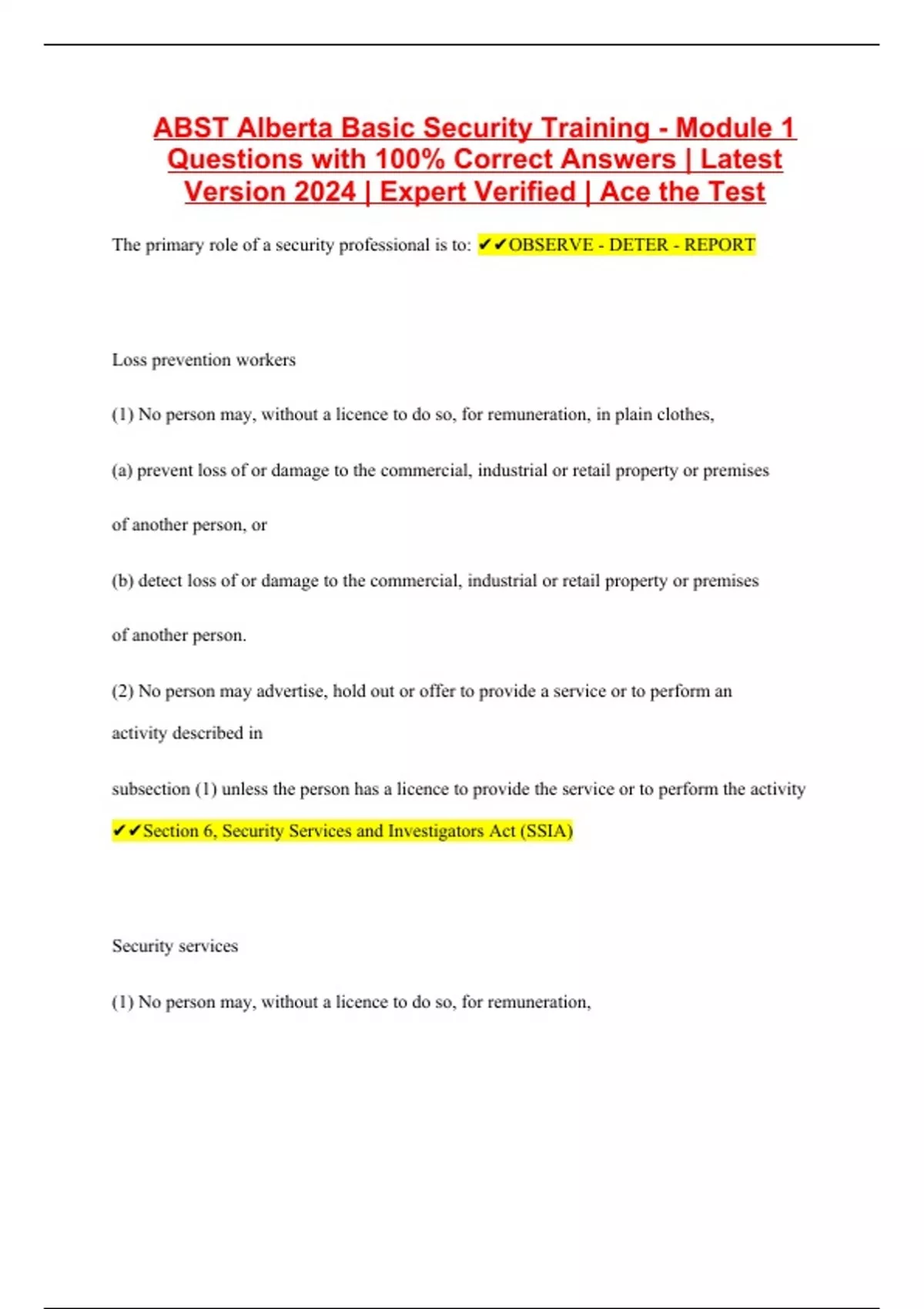 ABST Alberta Basic Security Training - Module 1 Questions with 100% Correct Answers | Latest Version 2024 | Expert Verified | Ace the Test
