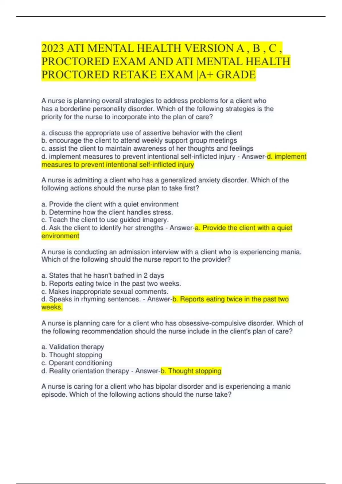 2023 ATI MENTAL HEALTH VERSION A , B , C , PROCTORED EXAM AND ATI MENTAL HEALTH PROCTORED RETAKE EXAM A+ GRADE
