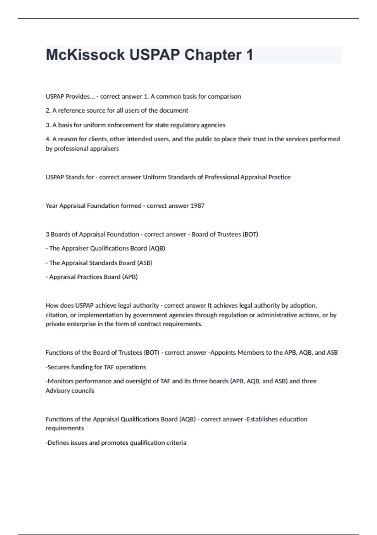 McKissock USPAP Chapter 1 Question and answers already passed McKissock USPAP Chapter 1 USPAP Provides... - correct answer 1. A common basis for comparison 2. A reference source for all users of the document 3. A basis for uniform enforcement for state regulatory agencies 4. A reason for clients, other intended users, and the public to place their trust in the services performed by professional appraisers USPAP Stands for - correct answer Uniform Standards of Professional Appraisal Practice Year Appraisal Foundation formed - correct answer 1987 3 Boards of Appraisal Foundation - correct answer - Board of Trustees (BOT) - The Appraiser Qualifications Board (AQB) - The Appraisal Standards Board (ASB) - Appraisal Practices Board (APB) How does USPAP achieve legal authority - correct answer It achieves legal authority by adoption, citation, or implementation by government agencies through regulation or administrative actions, or by private enterprise in the form of contract requirements. Functions of the Board of Trustees (BOT) - correct answer -Appoints Members to the APB, AQB, and ASB -Secures funding for TAF operations -Monitors performance and oversight of TAF and its three boards (APB, AQB, and ASB) and three Advisory councils