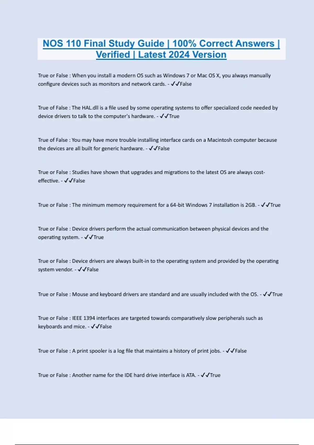 True or False : When you install a modern OS such as Windows 7 or Mac OS X, you always manually configure devices such as monitors and network cards. - False True of False : The HAL.dll is a file used by some operating systems to offer specialized code needed by device drivers to talk to the computer's hardware. - True True of False : You may have more trouble installing interface cards on a Macintosh computer because the devices are all built for generic hardware. - False True or False : Studies have shown that upgrades and migrations to the latest OS are always costeffective. - False True or False : The minimum memory requirement for a 64-bit Windows 7 installation is 2GB. - True True or False : Device drivers perform the actual communication between physical devices and the operating system. - True True or False : Device drivers are always built-in to the operating system and provided by the operating system vendor. - False True or False : Mouse and keyboard drivers are standard and are usually included with the OS. - True True or False : IEEE 1394 interfaces are targeted towards comparatively slow peripherals such as keyboards and mice. - False True or False : A print spooler is a log file that maintains a history of print jobs. - False True or False : Another name for the IDE hard drive interface is ATA. - True