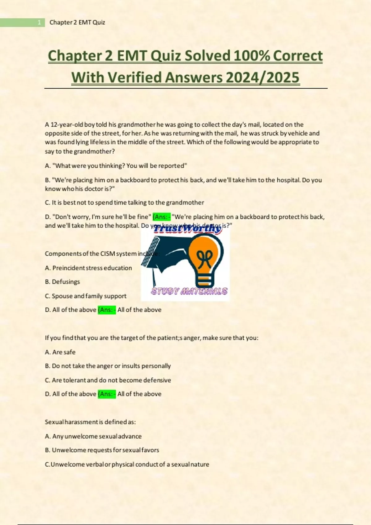 Chapter 2 EMT Quiz Solved 100% Correct With Verified Answers 2024/2025,Chapter 2 EMT Quiz Solved 100% Correct With Verified Answers 2024/2025,Chapter 2 EMT Quiz Solved 100% Correct With Verified Answers 2024/2025