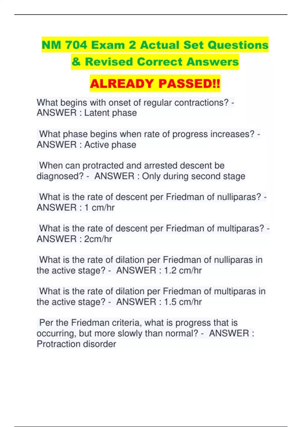 NM 704 Exam 2 Actual Set Questions & Revised Correct Answers ALREADY PASSED!! What begins with onset of regular contractions? - ANSWER : Latent phase What phase begins when rate of progress increases? - ANSWER : Active phase When can protracted and arrested descent be diagnosed? - ANSWER : Only during second stage What is the rate of descent per Friedman of nulliparas? - ANSWER : 1 cm/hr What is the rate of descent per Friedman of multiparas? - ANSWER : 2cm/hr What is the rate of dilation per Friedman of nulliparas in the active stage? - ANSWER : 1.2 cm/hr What is the rate of dilation per Friedman of multiparas in the active stage? - ANSWER : 1.5 cm/hr Per the Friedman criteria, what is progress that is occurring, but more slowly than normal? - ANSWER : Protraction disorder Per the Friedman criteria, what is progress that is no progress? - ANSWER : Arrest disorder Per Friedman, what is no dilation in 2 hours? - ANSWER : Arrest of dilation Per Friedman, what is no descent in 1 hour? - ANSWER : Arrest of descent Is there a difference in arrest disorders based on parity? - ANSWER : No