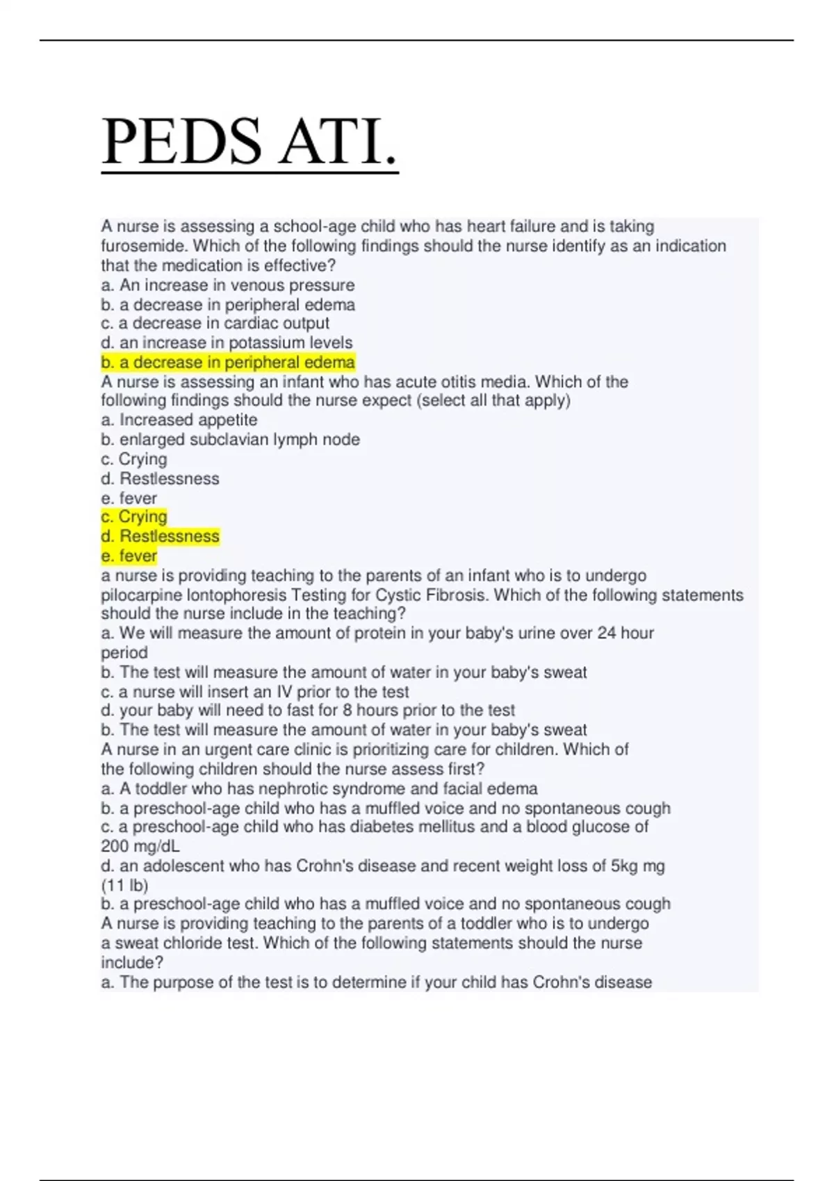 a nurse is providing teaching to the parents of an infant who is to undergo pilocarpine lontophoresis Testing for Cystic Fibrosis. Which of the following statements should the nurse include in the teaching? a. We will measure the amount of protein in your baby's urine over 24 hour period b. The test will measure the amount of water in your baby's sweat c. a nurse will insert an IV prior to the test d. your baby will need to fast for 8 hours prior to the test b. The test will measure the amount of water in your baby's sweat A nurse in an urgent care clinic is prioritizing care for children. Which of the following children should the nurse assess first? a. A toddler who has nephrotic syndrome and facial edema b. a preschool-age child who has a muffled voice and no spontaneous cough c. a preschool-age child who has diabetes mellitus and a blood glucose of 200 mg/dL d. an adolescent who has Crohn's disease and recent weight loss of 5kg mg (11 lb) b. a preschool-age child who has a muffled voice and no spontaneous cough A nurse is providing teaching to the parents of a toddler who is to undergo a sweat chloride test. Which of the following statements should the nurse include? a. The purpose of the test is to determine if your child has Crohn's disease
