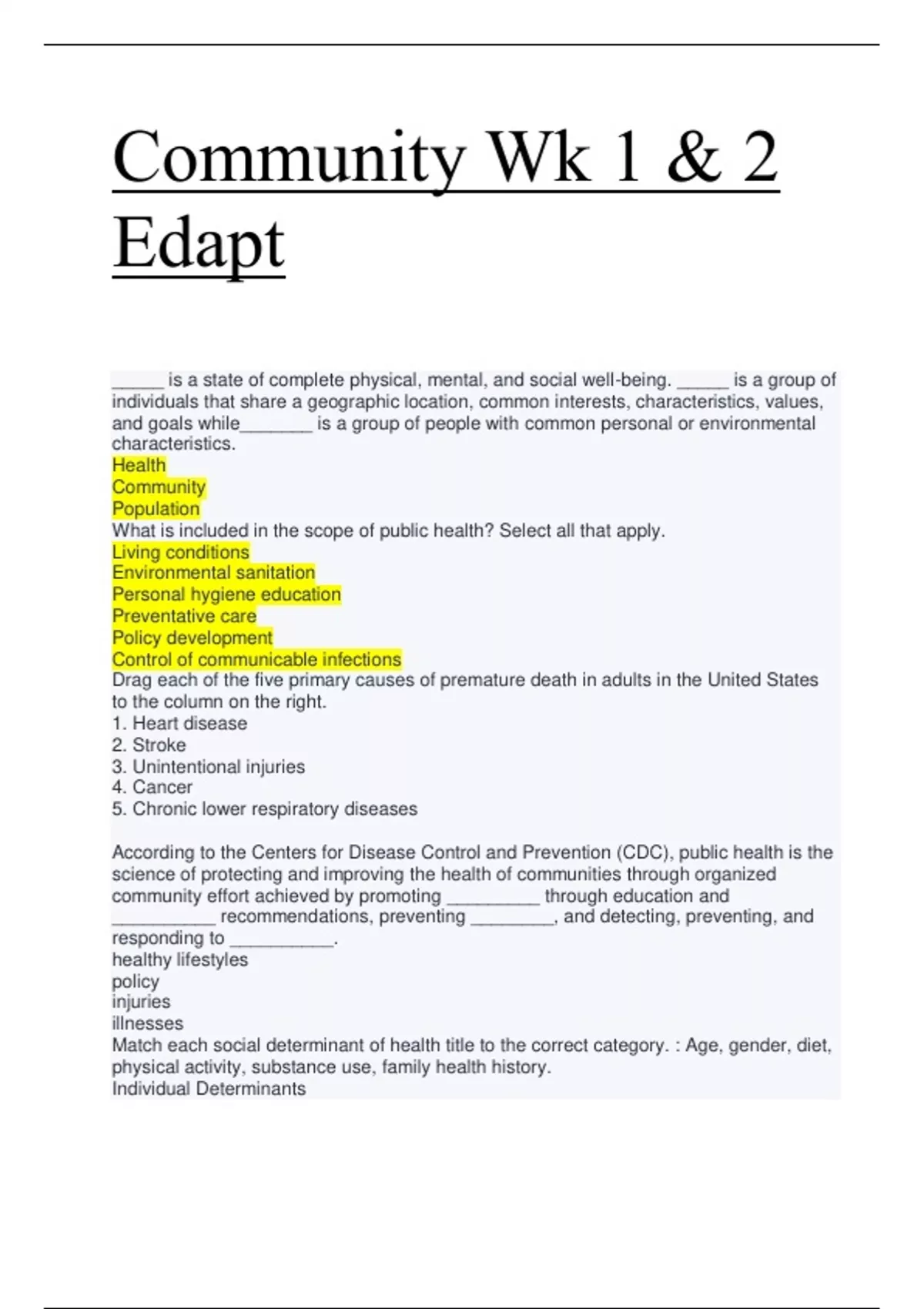 According to the Centers for Disease Control and Prevention (CDC), public health is the science of protecting and improving the health of communities through organized community effort achieved by promoting _________ through education and __________ recommendations, preventing ________, and detecting, preventing, and responding to __________. healthy lifestyles policy injuries illnesses Match each social determinant of health title to the correct category. : Age, gender, diet, physical activity, substance use, family health history. Individual Determinants