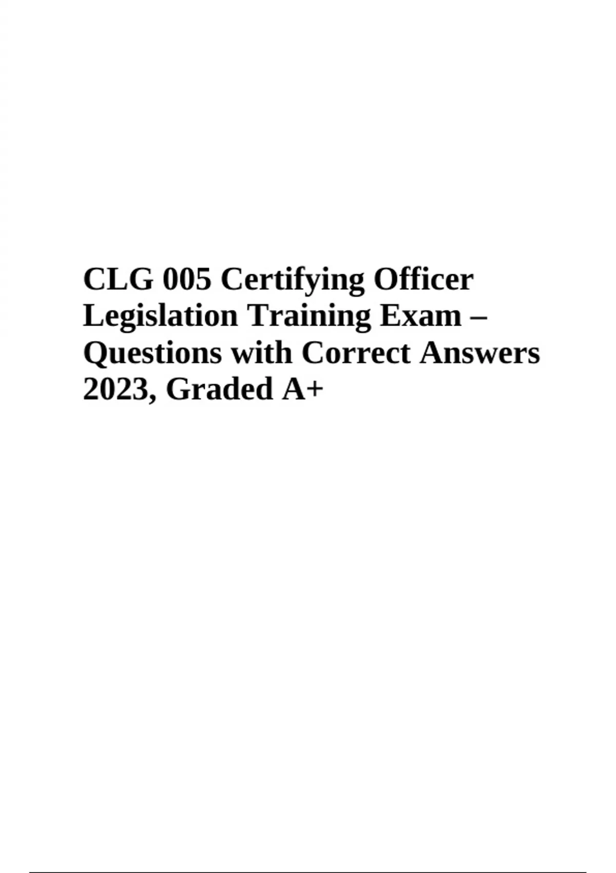 CLG 005 Certifying Officer Legislation Training Exam – Questions with Correct Answers 2023, Graded A+CLG 005 Certifying Officer Legislation Training Exam – Questions with Correct Answers 2023, Graded A+