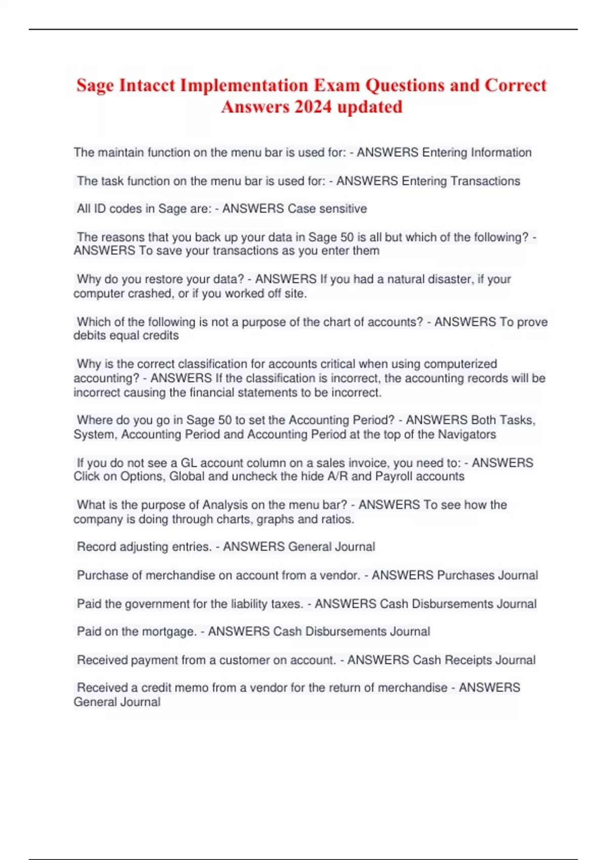 Sage Intacct Implementation Exam Questions and Correct Answers 2024 updated The maintain function on the menu bar is used for: - ANSWERS Entering Information The task function on the menu bar is used for: - ANSWERS Entering Transactions All ID codes in Sage are: - ANSWERS Case sensitive The reasons that you back up your data in Sage 50 is all but which of the following? - ANSWERS To save your transactions as you enter them Why do you restore your data? - ANSWERS If you had a natural disaster, if your computer crashed, or if you worked off site. Which of the following is not a purpose of the chart of accounts? - ANSWERS To prove debits equal credits Why is the correct classification for accounts critical when using computerized accounting? - ANSWERS If the classification is incorrect, the accounting records will be incorrect causing the financial statements to be incorrect. Where do you go in Sage 50 to set the Accounting Period? - ANSWERS Both Tasks, System, Accounting Period and Accounting Period at the top of the Navigators If you do not see a GL account column on a sales invoice, you need to: - ANSWERS Click on Options, Global and uncheck the hide A/R and Payroll accounts What is the purpose of Analysis on the menu bar? - ANSWERS To see how the company is doing through charts, graphs and ratios. Record adjusting entries. - ANSWERS General Journal Purchase of merchandise on account from a vendor. - ANSWERS Purchases Journal Paid the government for the liability taxes. - ANSWERS Cash Disbursements Journal Paid on the mortgage. - ANSWERS Cash Disbursements Journal Received payment from a customer on account. - ANSWERS Cash Receipts Journal Received a credit memo from a vendor for the return of merchandise - ANSWERS General Journal Purchase of supplies for cash - ANSWERS Cash Disbursements Journal Record the payroll for the week. - ANSWERS General Journal Sale of merchandise on account to a customer. - ANSWERS Sales Journal Paid the telephone bill. - ANSWERS Cash Disbursements Journal Investment of equipment by the owner. - ANSWERS General Journal Pay the vendor for a purchase on account. - ANSWERS Cash Disbursements Journal Record the payroll tax expense for the week. - ANSWERS General Journal Sale of merchandise for cash to customer - ANSWERS Cash Receipts Journal Paid the dividends for the quarter. - ANSWERS Cash Disbursements Journal Borrowed cash from the bank for a long-term note. - ANSWERS Cash Receipts Journal Paid the employees. - ANSWERS Cash Disbursements Journal Issue a credit memo to a customer for the return of damaged goods. - ANSWERS General Journal Purchase office supplies on account. - ANSWERS Purchases Journal Paid the state for the sales taxes. - ANSWERS Cash Disbursements Journal Account Number for Sales Discounts - ANSWERS 40037 Account # for Accumulated Depreciation - Computer Equipment - ANSWERS 10037 Account # for Note Payable - ANSWERS 20037 Account # for Prepaid Insurance - ANSWERS 10037 Acct. # for J. Roberts, Drawing - ANSWERS 30037 Acct. # for Depreciation Expense - Computer Equipment - ANSWERS 60037 Acct. # for Sales - ANSWERS 40037 Acct. # for Merchandise Inventory - ANSWERS 10037 Acct. # for Purchases Discounts - ANSWERS 50037 Acct. # for Computer Equipment - ANSWERS 10037 Acct. Classification for Sales Discounts - ANSWERS Income Acct. Classification for Accumulated Depreciation - Computer Equipment - ANSWERS Fixed Asset Acct. Classification for Note Payable (36 months) - ANSWERS Long-term Liability Acct. Classification for Prepaid Insurance - ANSWERS Current Asset Acct. Classification for J. Roberts, Drawing - ANSWERS Equity Acct. Classification for Depreciation Expense - Computer Equipment - ANSWERS Expense Acct. Classification for Sales - ANSWERS Income Acct. Classification for Merchandise Inventory - ANSWERS Inventory Acct. Classification for Purchases Discounts - ANSWERS Cost of Goods Sold Accts. Classification for Computer Equipment - ANSWERS Fixed Asset The expense area in write checks can be used for recording: - ANSWERS Noninventory assets purchased with cash. AND Liabilitie