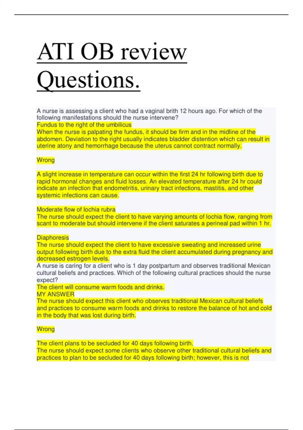 cultural beliefs and practices. Which of the following cultural practices should the nurse expect? The client will consume warm foods and drinks. MY ANSWER The nurse should expect this client who observes traditional Mexican cultural beliefs and practices to consume warm foods and drinks to restore the balance of hot and cold in the body that was lost during birth. Wrong The client plans to be secluded for 40 days following birth. The nurse should expect some clients who observe other traditional cultural beliefs and practices to plan to be secluded for 40 days following birth; however, this is not recognized as a traditional Mexican cultural belief. The client plans to burn the placenta upon returning home.The nurse should expect some clients who observe other traditional cultural beliefs and practices to plan to burn or bury the placenta; however, this is not recognized as a traditional Mexican cultural belief. The client will avoid eating pork products. The nurse should expect some clients who observe other traditional religious beliefs and practices to avoid consuming pork and pork products; however, this is not recognized as a traditional Mexican cultural belief. A nurse is teaching a new parent about caring for his newborn's circumcision. Which of the following information should the nurse include? Monitor the circumcision every 4 hr. The nurse should instruct the parent to monitor the circumcision at least every 4 hr for bleeding or manifestations of infection. The parent should apply gentle pressure with a sterile gauze square if bleeding occurs and notify the provider if bleeding does not stop with gentle pressure. Wrong Wash the circumcision with soapy water once per day. The nurse should instruct the parent to clean the circumcision gently with plain warm water to remove urine and feces. The parent can clean the circumcision with mild soap after it heals, usually in about 5 to 6 days. Apply the diaper tightly to apply pressure to the circumcision. The nurse should instruct the parent to apply the diaper loosely to prevent pressure on the circumcision. A loosely applied diaper decreases the risk of irritation and bleeding. Clean the circumcision with a baby wipe at each diaper change. The nurse should instruct the parent to clean the circumcision gently with plain warm water to remove urine and feces. The parent should not use a baby wipe as these can contain alcohol and cause pain for the newborn. A nurse is teaching a client who is at 18 weeks of gestation about exercise during pregnancy. Which of the following information should the nurse include? "Check your pulse every 10 minutes during exercise." MY ANSWER The client should monitor her pulse rate every 10 to 15 min while exercising. If the client's pulse rate is greater than 140/min, she should stop and rest. The client should be able to carry on a conversation while exercising. Wrong "Try to exercise for one hour on most days of the week." The client should plan to exercise for 30 min every day if possible. Exercise can be divided into two 15-min sessions with a rest period in between. The client should avoid exercising in hot, humid weather because this can cause hyperthermia.