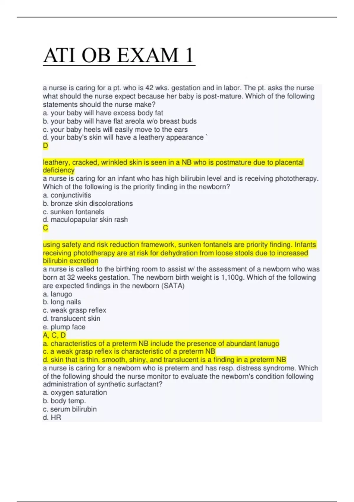 using safety and risk reduction framework, sunken fontanels are priority finding. Infants receiving phototherapy are at risk for dehydration from loose stools due to increased bilirubin excretion a nurse is called to the birthing room to assist w/ the assessment of a newborn who was born at 32 weeks gestation. The newborn birth weight is 1,100g. Which of the following are expected findings in the newborn (SATA) a. lanugo b. long nails c. weak grasp reflex d. translucent skin e. plump face A, C, D a. characteristics of a preterm NB include the presence of abundant lanugo c. a weak grasp reflex is characteristic of a preterm NB d. skin that is thin, smooth, shiny, and translucent is a finding in a preterm NB a nurse is caring for a newborn who is preterm and has resp. distress syndrome. Which of the following should the nurse monitor to evaluate the newborn's condition following administration of synthetic surfactant? a. oxygen saturation b. body temp. c. serum bilirubin d. HR