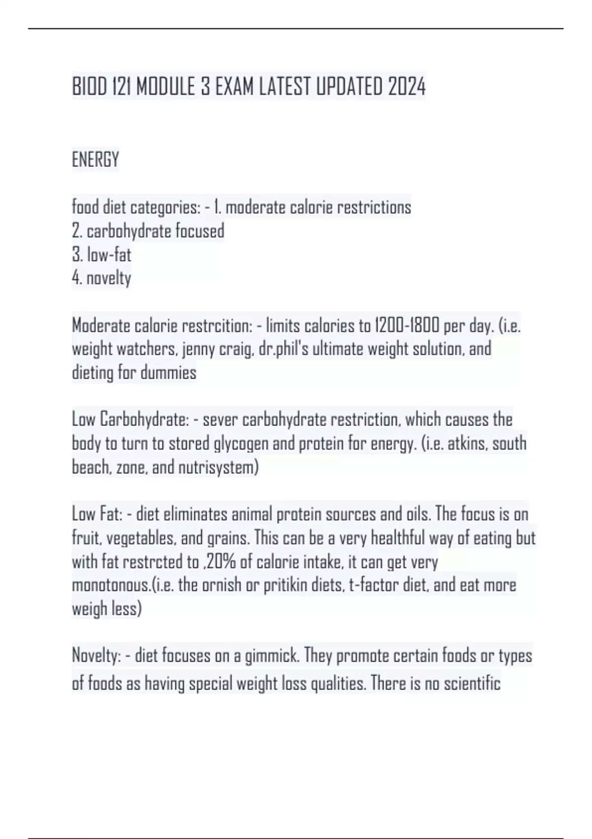 BIOD 121 MODULE 3 EXAM LATEST UPDATED 2024 ENERGY food diet categories: - 1. moderate calorie restrictions 2. carbohydrate focused 3. low-fat 4. novelty Moderate calorie restrcition: - limits calories to per day. (i.e. weight watchers, jenny craig, 's ultimate weight solution, and dieting for dummies Low Carbohydrate: - sever carbohydrate restriction, which causes the body to turn to stored glycogen and protein for energy. (i.e. atkins, south beach, zone, and nutrisystem) Low Fat: - diet eliminates animal protein sources and oils. The focus is on fruit, vegetables, and grains. This can be a very healthful way of eating but with fat restrcted to ,20% of calorie intake, it can get very monotonous.(i.e. the ornish or pritikin diets, t-factor diet, and eat more weigh less) Novelty: - diet focuses on a gimmick. They promote certain foods or types of foods as having special weight loss qualities. There is no scientific evidence to back up any claims. (examples: the cabbage soup diet, the beverly hills diet, and the cookie diet) Energy balance - a state when one's energy intake is equivalent to the amount of energy expended Energy in equals energy out (calories consumed is burned through basic body functions + exercise - energy balance positive energy balance - occurs if more calories (energy) are consumed than expended examples of periods in life when you need to be in a positive energy balance state: - pregnancy, childhood, and adolescence in growth spurts 1 pound in a week is equivalent to : - 500 extra calories a day Hyperplasia - an increase in the number of fat cells often occurring during periods of growth, such as adolescence or pregnancy Hypertrophy - an increase in the size of fat cells, most often seen in periods of low growth and maintenance, such as throughout adulthood Negative energy balance -occurs if fewer calories are consumed than calories expended