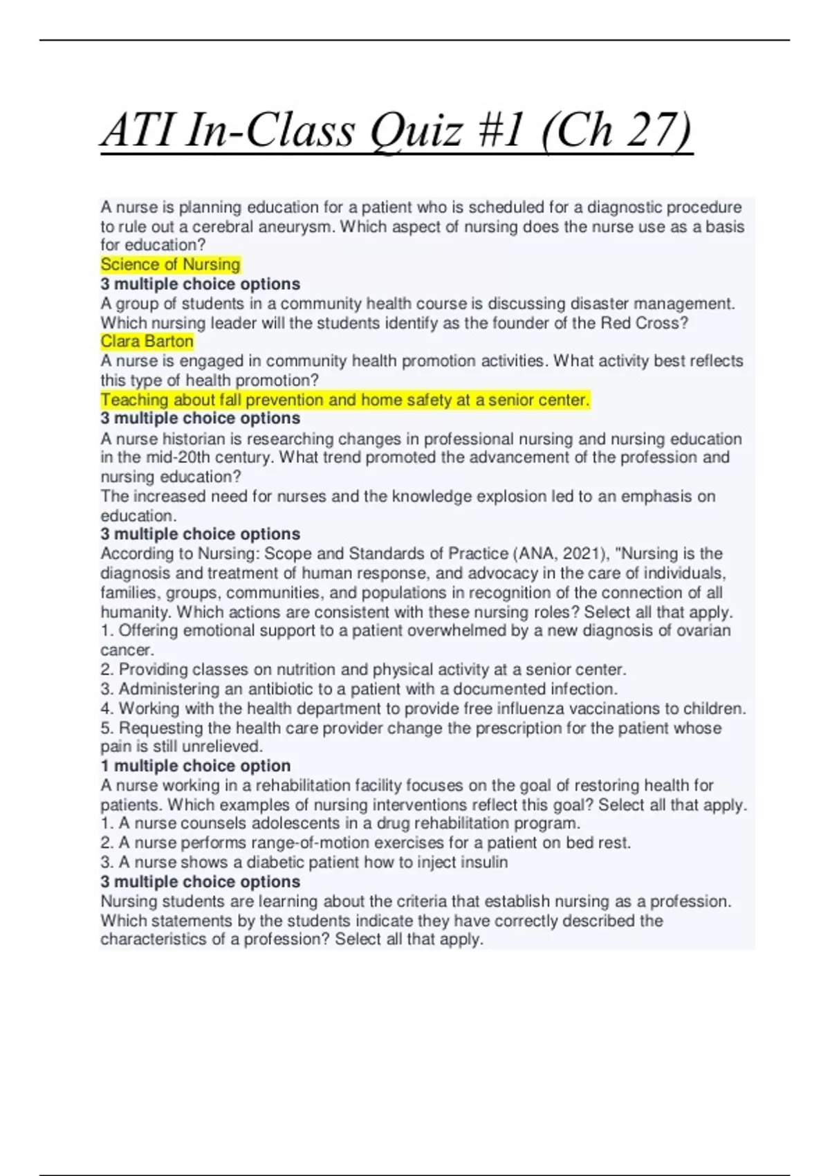 n the mid-20th century. What trend promoted the advancement of the profession and nursing education? The increased need for nurses and the knowledge explosion led to an emphasis on education. 3 multiple choice options According to Nursing: Scope and Standards of Practice (ANA, 2021), "Nursing is the diagnosis and treatment of human response, and advocacy in the care of individuals, families, groups, communities, and populations in recognition of the connection of all humanity. Which actions are consistent with these nursing roles? Select all that apply. 1. Offering emotional support to a patient overwhelmed by a new diagnosis of ovarian cancer. 2. Providing classes on nutrition and physical activity at a senior center. 3. Administering an antibiotic to a patient with a documented infection. 4. Working with the health department to provide free influenza vaccinations to children. 5. Requesting the health care provider change the prescription for the patient whose pain is still unrelieved. 1 multiple choice option