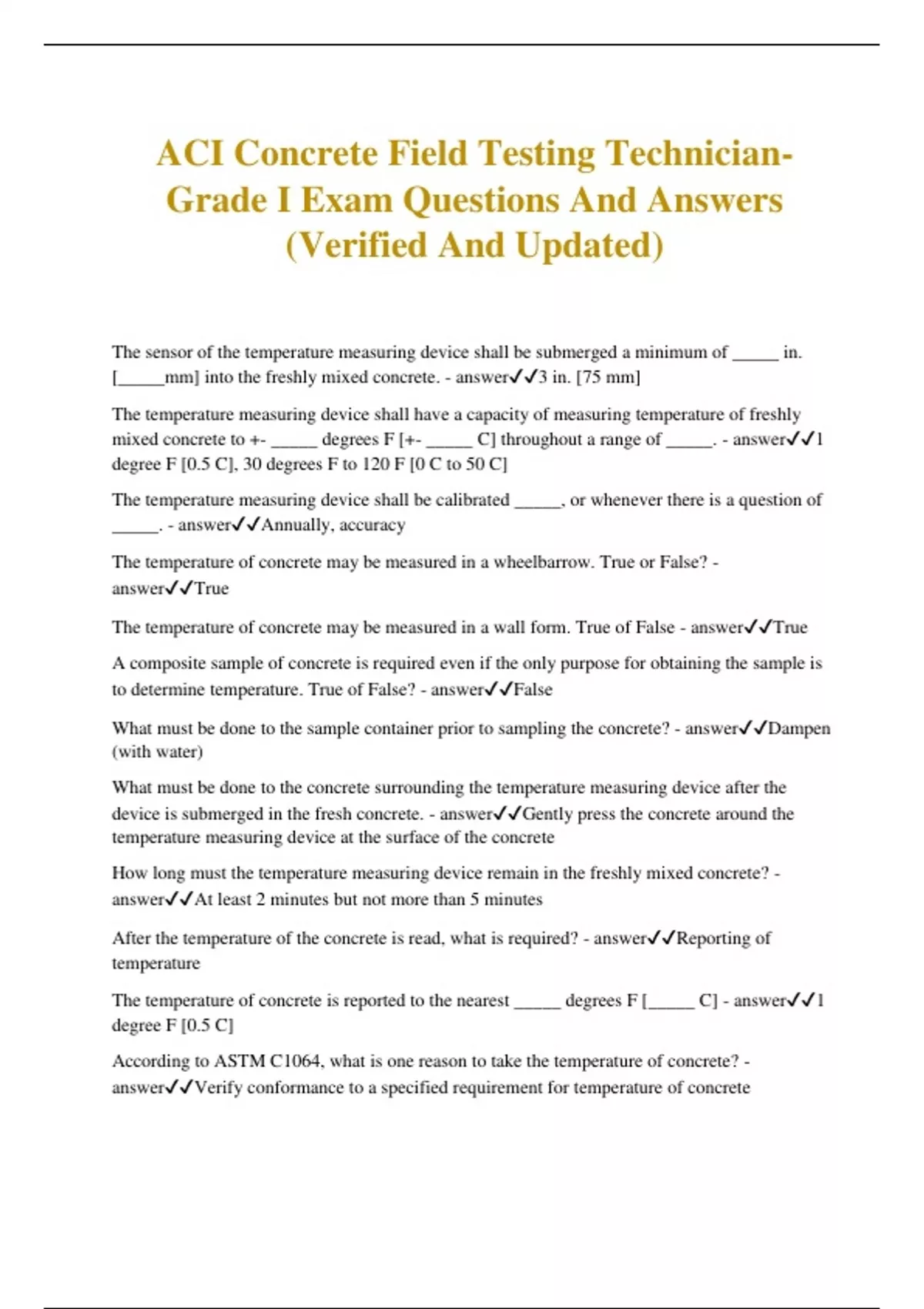 ACI Concrete Field Testing Technician- Grade I Exam Questions And Answers (Verified And Updated) The sensor of the temperature measuring device shall be submerged a minimum of _____ in. [_____mm] into the freshly mixed concrete. - answer3 in. [75 mm] The temperature measuring device shall have a capacity of measuring temperature of freshly mixed concrete to +- _____ degrees F [+- _____ C] throughout a range of _____. - answer1 degree F [0.5 C], 30 degrees F to 120 F [0 C to 50 C] The temperature measuring device shall be calibrated _____, or whenever there is a question of _____. - answerAnnually, accuracy The temperature of concrete may be measured in a wheelbarrow. True or False? - answerTrue The temperature of concrete may be measured in a wall form. True of False - answerTrue A composite sample of concrete is required even if the only purpose for obtaining the sample is to determine temperature. True of False? - answerFalse What must be done to the sample container prior to sampling the concrete? - answerDampen (with water) What must be done to the concrete surrounding the temperature measuring device after the device is submerged in the fresh concrete. - answerGently press the concrete around the temperature measuring device at the surface of the concrete How long must the temperature measuring device remain in the freshly mixed concrete? - answerAt least 2 minutes but not more than 5 minutes After the temperature of the concrete is read, what is required? - answerReporting of temperature The temperature of concrete is reported to the nearest _____ degrees F [_____ C] - answer1 degree F [0.5 C] According to ASTM C1064, what is one reason to take the temperature of concrete? - answerVerify conformance to a specified requirement for temperature of concrete A maximum temperature of freshly mixed concrete is specified in ASTM C1064. True of False? - answerFalse The sample of concrete used for temperature determination must be rodded 25 times. True or False? - answerFalse Sampling by this method is required when tests are to be made to determine _____ with specification requirements. - answerCompliance This method covers sampling from four types of mixtures which are _____, _____, _____, and _____. - answerStationary mixers, paving mixers, revolving drum mixers, and open top mixers The maximum allowable time between obtaining the first and final portions of a composite sample is _____ minutes. - answer15 Portions of a composite sample shall be thoroughly remixed bfore beginning tests on the sample. True of False? - answerTrue The maximum elapsed time allowed between obtaining the final portion of the composite sample and beginning the tests for slump, temperature, and air content is _____ minutes. - answer5 The molding of strength test specimens shall begin within _____ minutes after fabricating the composite sample. - answer15 The concrete sample must be protected from contamination and _____. - answerRapid evaporation The minimum size sample for making strength test specimens is _____. - answer28 L (1ft^3) When sampling from a stationary mixer, the batch must be sampled at _____ or more regularly spaced intervals during discharge of the middle portion of the batch - answer2 The composite sample for a paving mixer must represent a minimum of _____ different portions of the batch of concrete taken from the pile after discharge. - answer5 When sampling from a revolving drum truck mixer, concrete must be sampled at a minimum of _____ regularly spaced intervals during discharge of the middle portion of this batch. - answer2 Concrete samples from a truck mixer must be obtained before any water or admixtures are added to the mixer at the job site. True or False? - answerFalse The composite samples from a truck mixer must be obtained from the _____ portion of the batch. - answerMiddle When the concrete contains aggregate larger than that permitted for a particular test method, the sample of concrete must be _____ _____ before making the test. - answerWet sieved