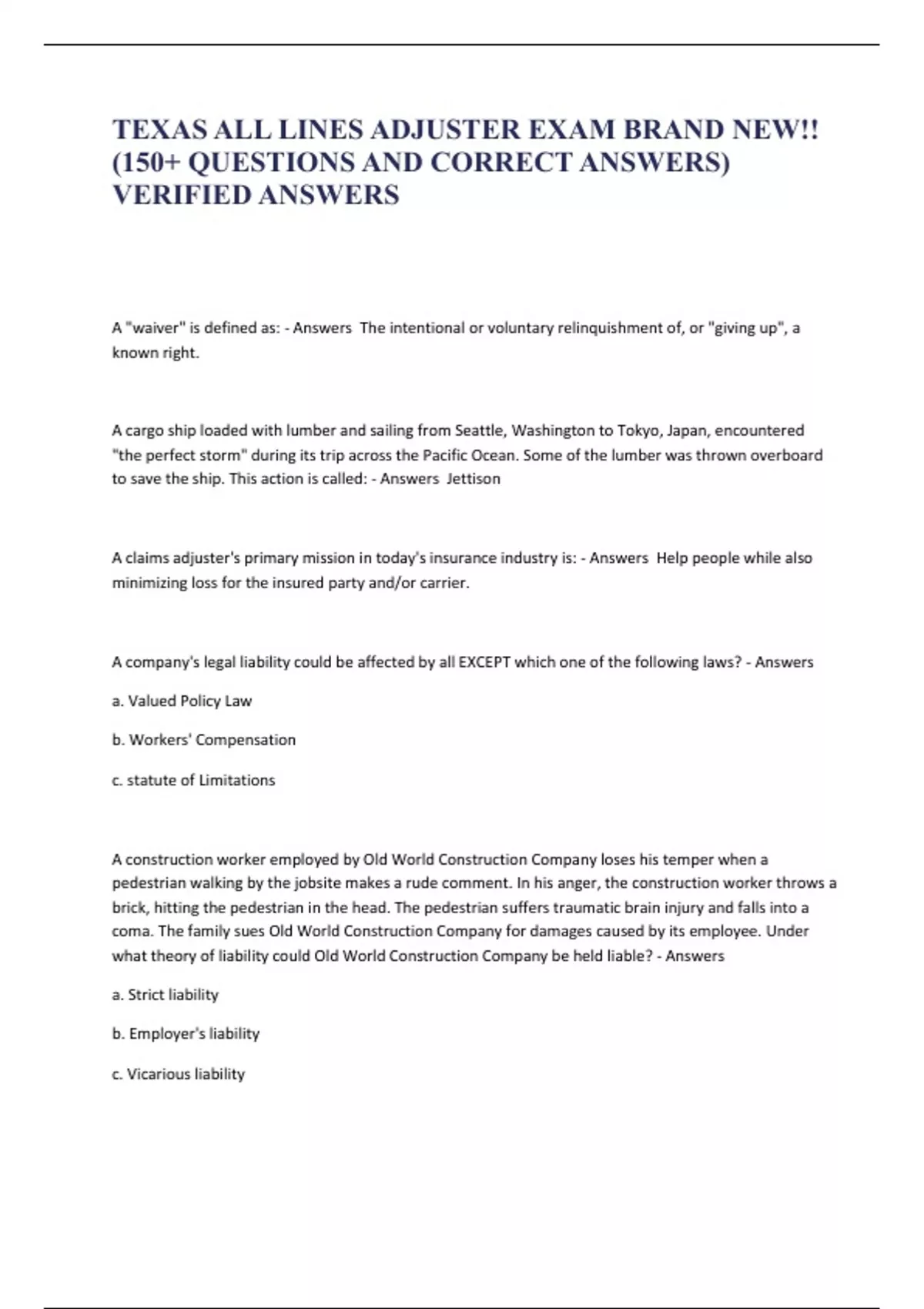 TEXAS ALL LINES ADJUSTER EXAM BRAND NEW!! (150+ QUESTIONS AND CORRECT ANSWERS) VERIFIED ANSWERS A "waiver" is defined as: - Answers The intentional or voluntary relinquishment of, or "giving up", a known right. A cargo ship loaded with lumber and sailing from Seattle, Washington to Tokyo, Japan, encountered "the perfect storm" during its trip across the Pacific Ocean. Some of the lumber was thrown overboard to save the ship. This action is called: - Answers Jettison A claims adjuster's primary mission in today's insurance industry is: - Answers Help people while also minimizing loss for the insured party and/or carrier. A company's legal liability could be affected by all EXCEPT which one of the following laws? - Answers a. Valued Policy Law b. Workers' Compensation c. statute of Limitations A construction worker employed by Old World Construction Company loses his temper when a pedestrian walking by the jobsite makes a rude comment. In his anger, the construction worker throws a brick, hitting the pedestrian in the head. The pedestrian suffers traumatic brain injury and falls into a coma. The family sues Old World Construction Company for damages caused by its employee. Under what theory of liability could Old World Construction Company be held liable? - Answers a. Strict liability b. Employer's liability c. Vicarious liability A contract that provides insurance coverage for up to 30 days, pending the issuance of a permanent policy is known as a: - Answers a. Endorsement b. Binder c. Conditional Contract A customer bought a new window A/C unit from a local appliance store. One of the store's employees went to the customer's house to install it. While installing it, he dropped the A/C unit out of the window, which hit the customer's 8-year old daughter, who was playing in the yard outside. The child's arm was fractured. Under what coverage would an insurance policy respond to a claim made by the customer against the appliance store? - Answers a. Operations b. Completed Operations c. Products Liability A customer of the Sunshine Grocery Store hit her leg on a low shelf in the isle of the store. The claim was assigned to you for handling. After contacting the claimant and taking a statement, you learn that the injury was minor and, at most, an inconvenience. Medical expenses were only $525.00 and there were no complications. You think the best way to handle the case Is to offer to pay her medical bills without admitting liability and try backing away without committing to any kind of settlement. How would you do it? - Answers Tell her you'll pay her bills and ask her to call you if she has any questions. You would then wish her well and, when the bills arrive, pay them under the business's Medical Payments coverage. A grocery store employee accidentally runs into a customer with a pallet of canned goods, injuring the customer's leg. What kind of claim would most likely be filed under the store's General Liability policy? - Answers A Premises Liability claim