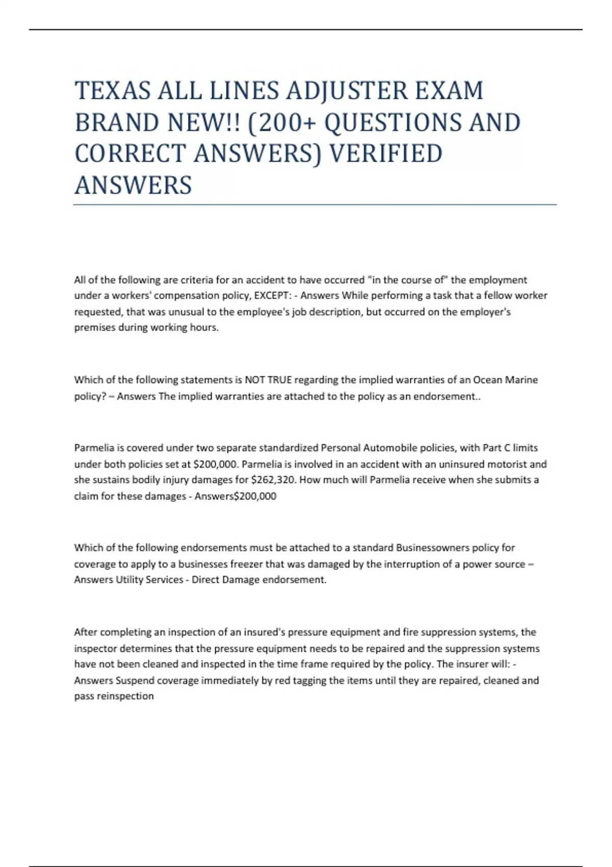 TEXAS ALL LINES ADJUSTER EXAM BRAND NEW!! (200+ QUESTIONS AND CORRECT ANSWERS) VERIFIED ANSWERS All of the following are criteria for an accident to have occurred "in the course of" the employment under a workers' compensation policy, EXCEPT: - Answers While performing a task that a fellow worker requested, that was unusual to the employee's job description, but occurred on the employer's premises during working hours. Which of the following statements is NOT TRUE regarding the implied warranties of an Ocean Marine policy? – Answers The implied warranties are attached to the policy as an endorsement.. Parmelia is covered under two separate standardized Personal Automobile policies, with Part C limits under both policies set at $200,000. Parmelia is involved in an accident with an uninsured motorist and she sustains bodily injury damages for $262,320. How much will Parmelia receive when she submits a claim for these damages - Answers$200,000 Which of the following endorsements must be attached to a standard Businessowners policy for coverage to apply to a businesses freezer that was damaged by the interruption of a power source – Answers Utility Services - Direct Damage endorsement. After completing an inspection of an insured's pressure equipment and fire suppression systems, the inspector determines that the pressure equipment needs to be repaired and the suppression systems have not been cleaned and inspected in the time frame required by the policy. The insurer will: - Answers Suspend coverage immediately by red tagging the items until they are repaired, cleaned and pass reinspection