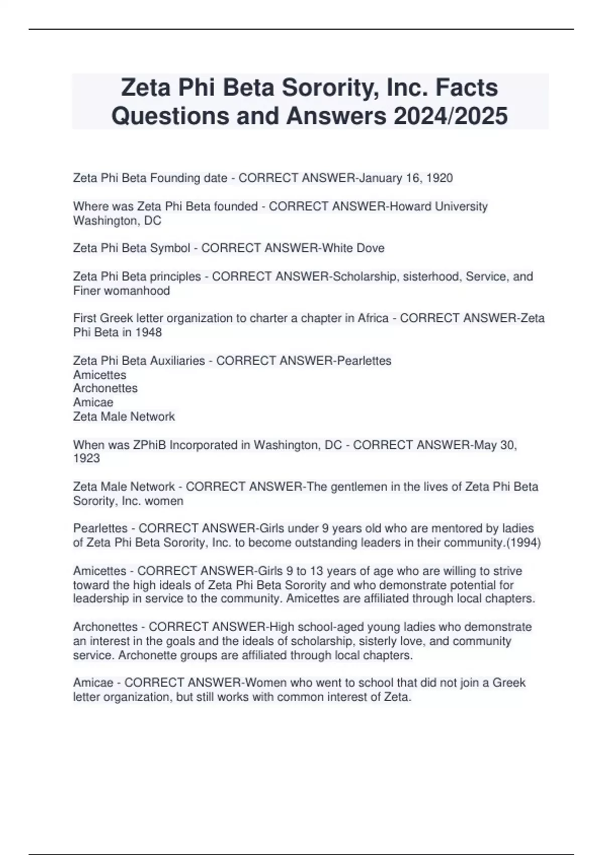 Zeta Phi Beta Founding date - CORRECT ANSWER-January 16, 1920 Where was Zeta Phi Beta founded - CORRECT ANSWER-Howard University Washington, DC Zeta Phi Beta Symbol - CORRECT ANSWER-White Dove Zeta Phi Beta principles - CORRECT ANSWER-Scholarship, sisterhood, Service, and Finer womanhood First Greek letter organization to charter a chapter in Africa - CORRECT ANSWER-Zeta Phi Beta in 1948 Zeta Phi Beta Auxiliaries - CORRECT ANSWER-Pearlettes Amicettes Archonettes Amicae Zeta Male Network When was ZPhiB Incorporated in Washington, DC - CORRECT ANSWER-May 30, 1923 Zeta Male Network - CORRECT ANSWER-The gentlemen in the lives of Zeta Phi Beta Sorority, Inc. women Pearlettes - CORRECT ANSWER-Girls under 9 years old who are mentored by ladies of Zeta Phi Beta Sorority, Inc. to become outstanding leaders in their community.(1994) Amicettes - CORRECT ANSWER-Girls 9 to 13 years of age who are willing to strive toward the high ideals of Zeta Phi Beta Sorority and who demonstrate potential for leadership in service to the community. Amicettes are affiliated through local chapters. Archonettes - CORRECT ANSWER-High school-aged young ladies who demonstrate an interest in the goals and the ideals of scholarship, sisterly love, and community service. Archonette groups are affiliated through local chapters. Amicae - CORRECT ANSWER-Women who went to school that did not join a Greek letter organization, but still works with common interest of Zeta. NPHC headquarters - CORRECT ANSWER-3951 Snapfinger parkway, suite 218, Decatur, Ga 3003