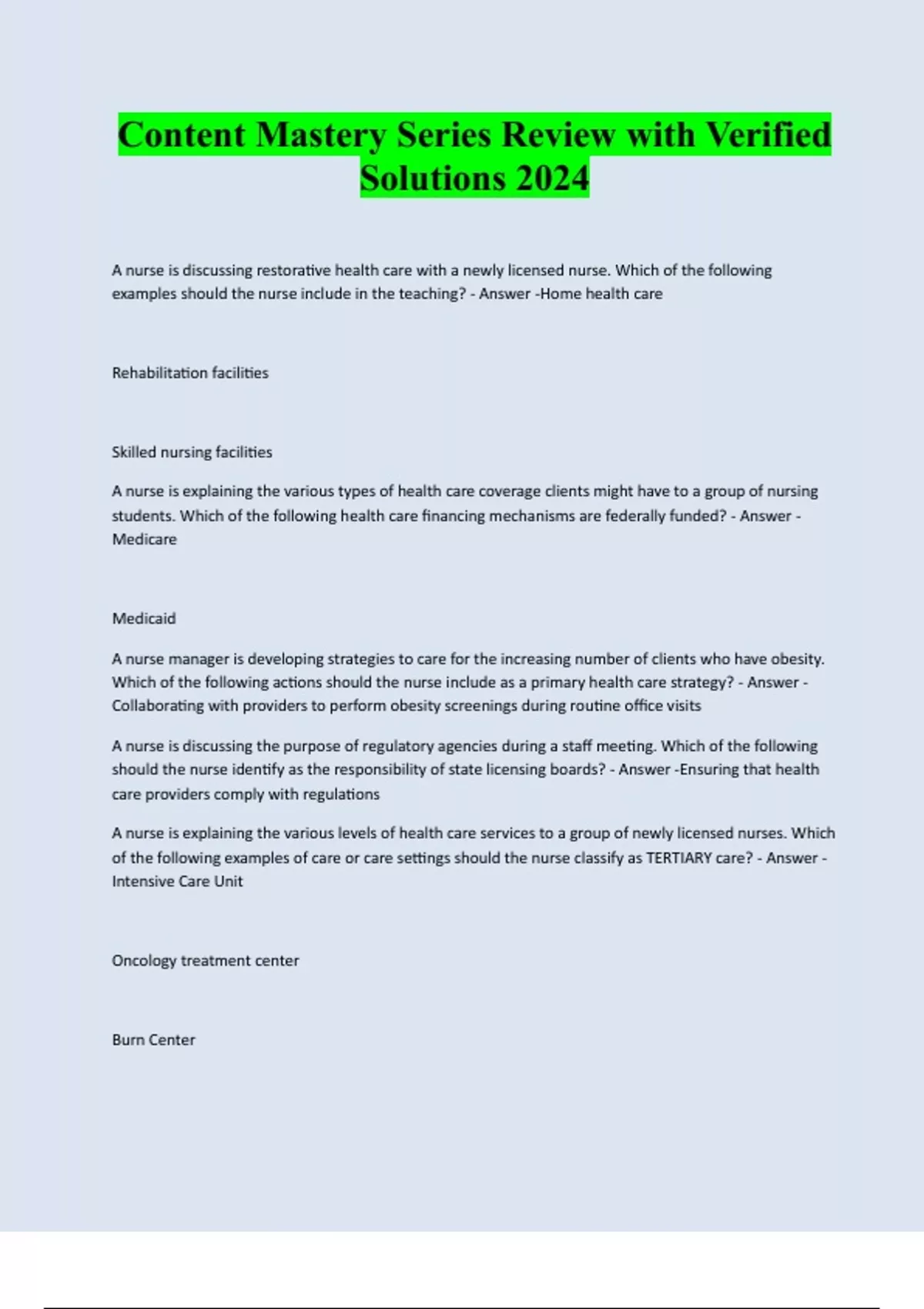 CONTENT MASTERY SERIES REVIEW ACTUAL 2025/2026 QUESTIONS AND 100% CORRECT ANSWERS A nurse is discussing restorative health care with a newly licensed nurse. Which of the following examples should the nurse include in the teaching? - Answer -Home health care Rehabilitation facilities Skilled nursing facilities A nurse is explaining the various types of health care coverage clients might have to a group of nursing students. Which of the following health care financing mechanisms are federally funded? - Answer - MedicareNeed assistance on Online classes, Exams & Assignments? Reach out for instant help!! Full Course Assistance, Plagiarism-free Essay Writing, Research Paper, Dissertation, Discussion Posts, etc…. Confidential & Secure services. Tutors are available for all subjects! Email now at: Medicaid A nurse manager is developing strategies to care for the increasing number of clients who have obesity. Which of the following actions should the nurse include as a primary health care strategy? - Answer - Collaborating with providers to perform obesity screenings during routine office visits A nurse is discussing the purpose of regulatory agencies during a staff meeting. Which of the following should the nurse identify as the responsibility of state licensing boards? - Answer -Ensuring that health care providers comply with regu