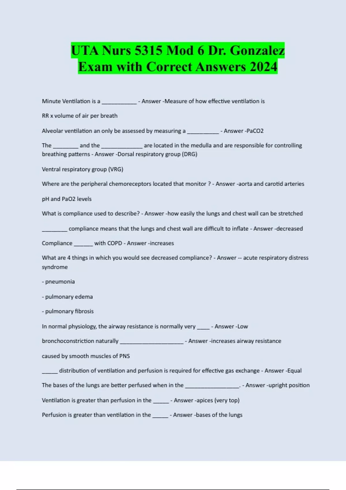 UTA Nurs 5315 Mod 6 Dr. Gonzalez Exam with Correct Answers 2024 Minute Ventilation is a ___________ - Answer -Measure of how effective ventilation is RR x volume of air per breath Alveolar ventilation an only be assessed by measuring a __________ - Answer -PaCO2 The ________ and the _____________ are located in the medulla and are responsible for controlling breathing patterns - Answer -Dorsal respiratory group (DRG) Ventral respiratory group (VRG) Where are the peripheral chemoreceptors located that monitor ? - Answer -aorta and carotid arteries pH and PaO2 levels What is compliance used to describe? - Answer -how easily the lungs and chest wall can be stretched ________ compliance means that the lungs and chest wall are difficult to inflate - Answer -decreased Compliance ______ with COPD - Answer -increases What are 4 things in which you would see decreased compliance? - Answer -- acute respiratory distress syndrome - pneumonia - pulmonary edema - pulmonary fibrosis In normal physiology, the airway resistance is normally very ____ - Answer -Low bronchoconstriction naturally ____________________ - Answer -increases airway resistance caused by smooth muscles of PNS _____ distribution of ventilation and perfusion is required for effective gas exchange - Answer -Equal The bases of the lungs are better perfused when in the _________________. - Answer -upright position Ventilation is greater than perfusion in the _____ - Answer -apices (very top) Perfusion is greater than ventilation in the _____ - Answer -bases of the lungsWhat is the ventilation perfusion ratio? - Answer -the relationship between ventilation and perfusion -normal ratio is 0.8=amount by which perfusion exceeds ventilation What is V/Q mismatch? - Answer -Ideally, ventilation is matched to perfusio