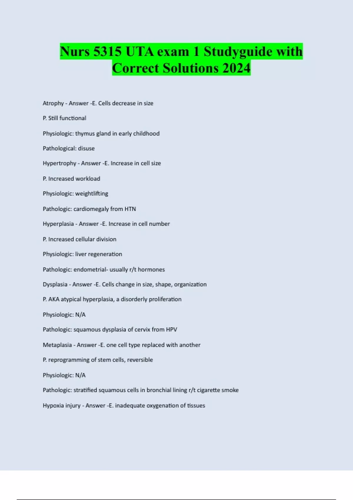 Nurs 5315 UTA exam 1 Studyguide with Correct Solutions 2024 Atrophy - Answer -E. Cells decrease in size P. Still functional Physiologic: thymus gland in early childhood Pathological: disuse Hypertrophy - Answer -E. Increase in cell size P. Increased workload Physiologic: weightlifting Pathologic: cardiomegaly from HTN Hyperplasia - Answer -E. Increase in cell number P. Increased cellular division Physiologic: liver regeneration Pathologic: endometrial- usually r/t hormones Dysplasia - Answer -E. Cells change in size, shape, organization P. AKA atypical hyperplasia, a disorderly proliferation Physiologic: N/A Pathologic: squamous dysplasia of cervix from HPV Metaplasia - Answer -E. one cell type replaced with another P. reprogramming of stem cells, reversible Physiologic: N/A Pathologic: stratified squamous cells in bronchial lining r/t cigarette smoke Hypoxia injury - Answer -E. inadequate oxygenation of tissuesP. decrease in mitochondrial function, decreased production of ATP increases anaerobic metabolism. eventual cell death. C.M. hypoxia, cyanosis, cognitive impairment, lethargy Free radical and ROS - Answer -E. normal byproduct of ATP production, will overwhelm the mitochondria- exhaust intracellular antioxidants P. lipid peroxidation, damage proteins, fragment DNA C.M. development in Alzheimer's, heart disease, Parkinson's disease, Amyotrophic Lateral Sclerosis Ethanol - Answer -E. mood altering drug, long term effects on liver and nutritiona