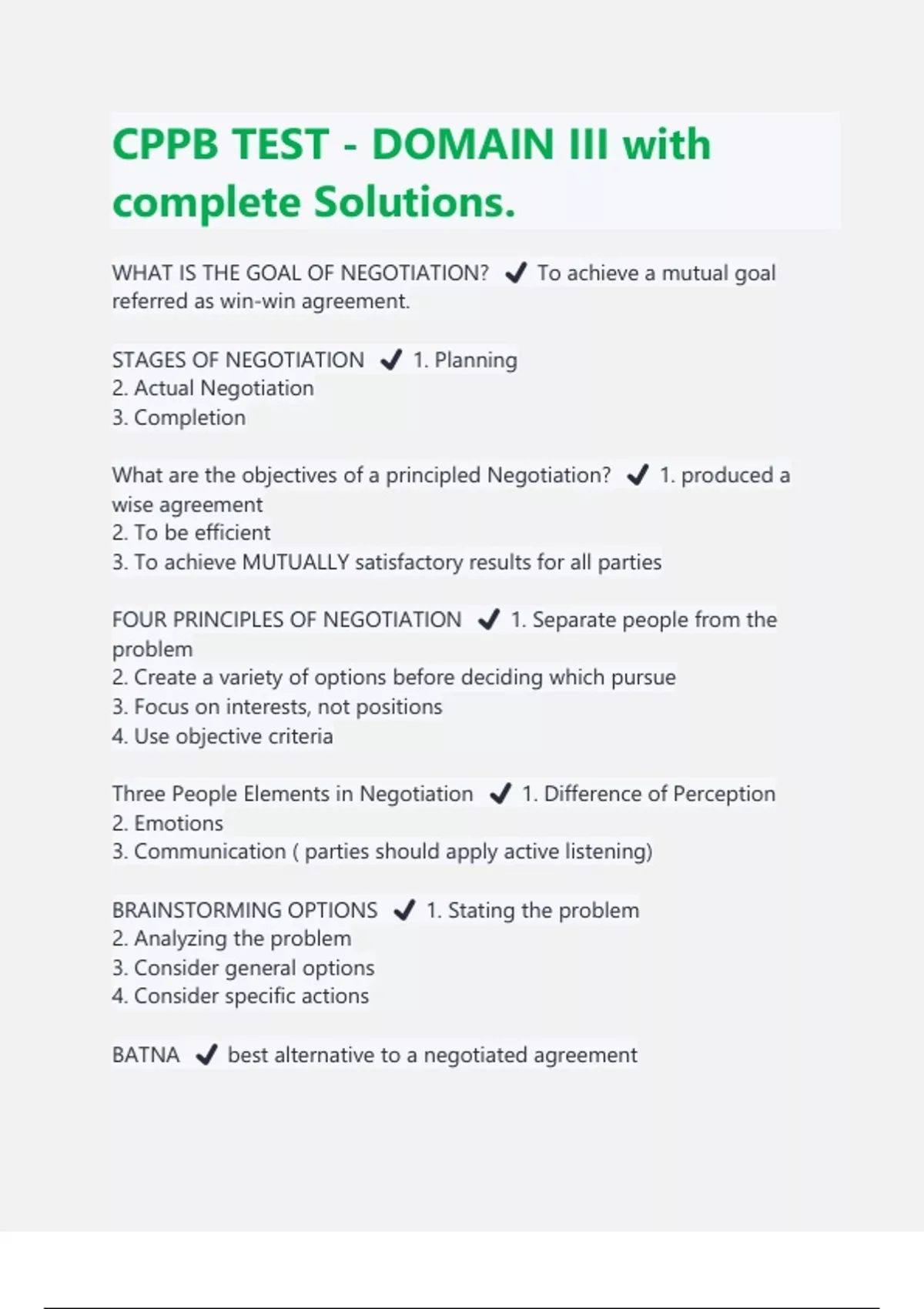CPPB TEST - DOMAIN III with complete Solutions. WHAT IS THE GOAL OF NEGOTIATION? ️ To achieve a mutual goal referred as win-win agreement. STAGES OF NEGOTIATION ️ 1. Planning 2. Actual Negotiation 3. Completion What are the objectives of a principled Negotiation? ️ 1. produced a wise agreement 2. To be efficient 3. To achieve MUTUALLY satisfactory results for all parties FOUR PRINCIPLES OF NEGOTIATION ️ 1. Separate people from the problem 2. Create a variety of options before deciding which pursue 3. Focus on interests, not positions 4. Use objective criteria Three People Elements in Negotiation ️ 1. Difference of Perception 2. Emotions 3. Communication ( parties should apply active listening) BRAINSTORMING OPTIONS ️ 1. Stating the problem 2. Analyzing the problem 3. Consider general options 4. Consider specific actions BATNA ️ best alternative to a negotiated agreement STONEWALLING ️ It is used to frustrate the opposition party and induce it to make a better offer in the hope of reaching agreement or make a negotiation error. Counter tactics: a) breaking off negotiations b) setting a deadline beyond which you will not continue if there is no evidence of good faith negotiating GOOD SAMARITAN ️ The other side acts as if it is doing you a favor or making a great sacrifice with its offer in order to put you off guard and persuade you to accept it without determining whether it is actually in your best interest. TAKE IT OR LEAVE IT ️ Other side has made its final offer and says it will no longer negotiate. Counter Tactic: a) to continue negotiating