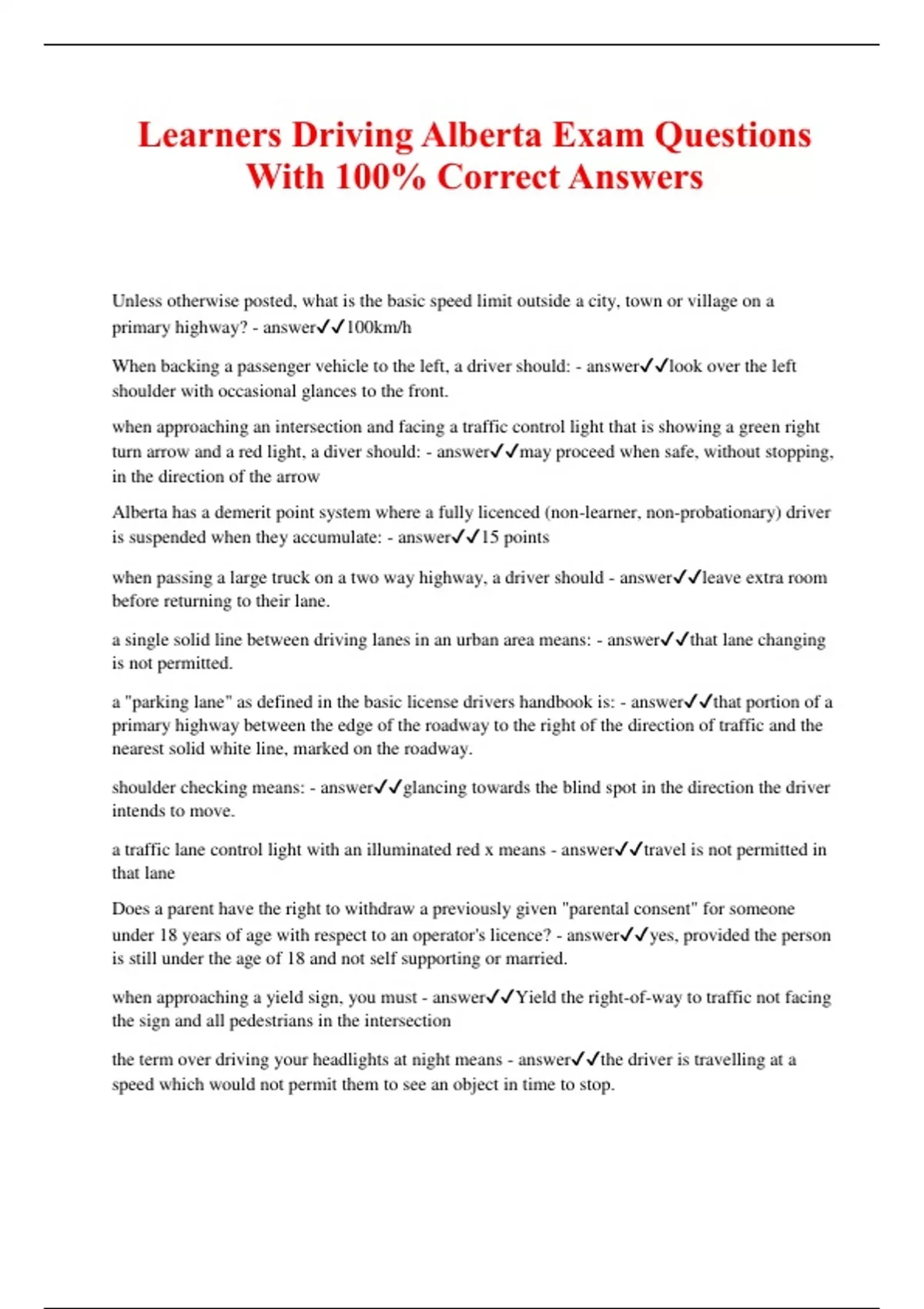 Learners Driving Alberta Exam Questions With 100% Correct Answers Unless otherwise posted, what is the basic speed limit outside a city, town or village on a primary highway? - answer100km/h When backing a passenger vehicle to the left, a driver should: - answerlook over the left shoulder with occasional glances to the front. when approaching an intersection and facing a traffic control light that is showing a green right turn arrow and a red light, a diver should: - answermay proceed when safe, without stopping, in the direction of the arrow Alberta has a demerit point system where a fully licenced (non-learner, non-probationary) driver is suspended when they accumulate: - answer15 points when passing a large truck on a two way highway, a driver should - answerleave extra room before returning to their lane. a single solid line between driving lanes in an urban area means: - answerthat lane changing is not permitted. a "parking lane" as defined in the basic license drivers handbook is: - answerthat portion of a primary highway between the edge of the roadway to the right of the direction of traffic and the nearest solid white line, marked on the roadway. shoulder checking means: - answerglancing towards the blind spot in the direction the driver intends to move. a traffic lane control light with an illuminated red x means - answertravel is not permitted in that lane Does a parent have the right to withdraw a previously given "parental consent" for someone under 18 years of age with respect to an operator's licence? - answeryes, provided the person is still under the age of 18 and not self supporting or married. when approaching a yield sign, you must - answerYield the right-of-way to traffic not facing the sign and all pedestrians in the intersection the term over driving your headlights at night means - answerthe driver is travelling at a speed which would not permit them to see an object in time to stop.