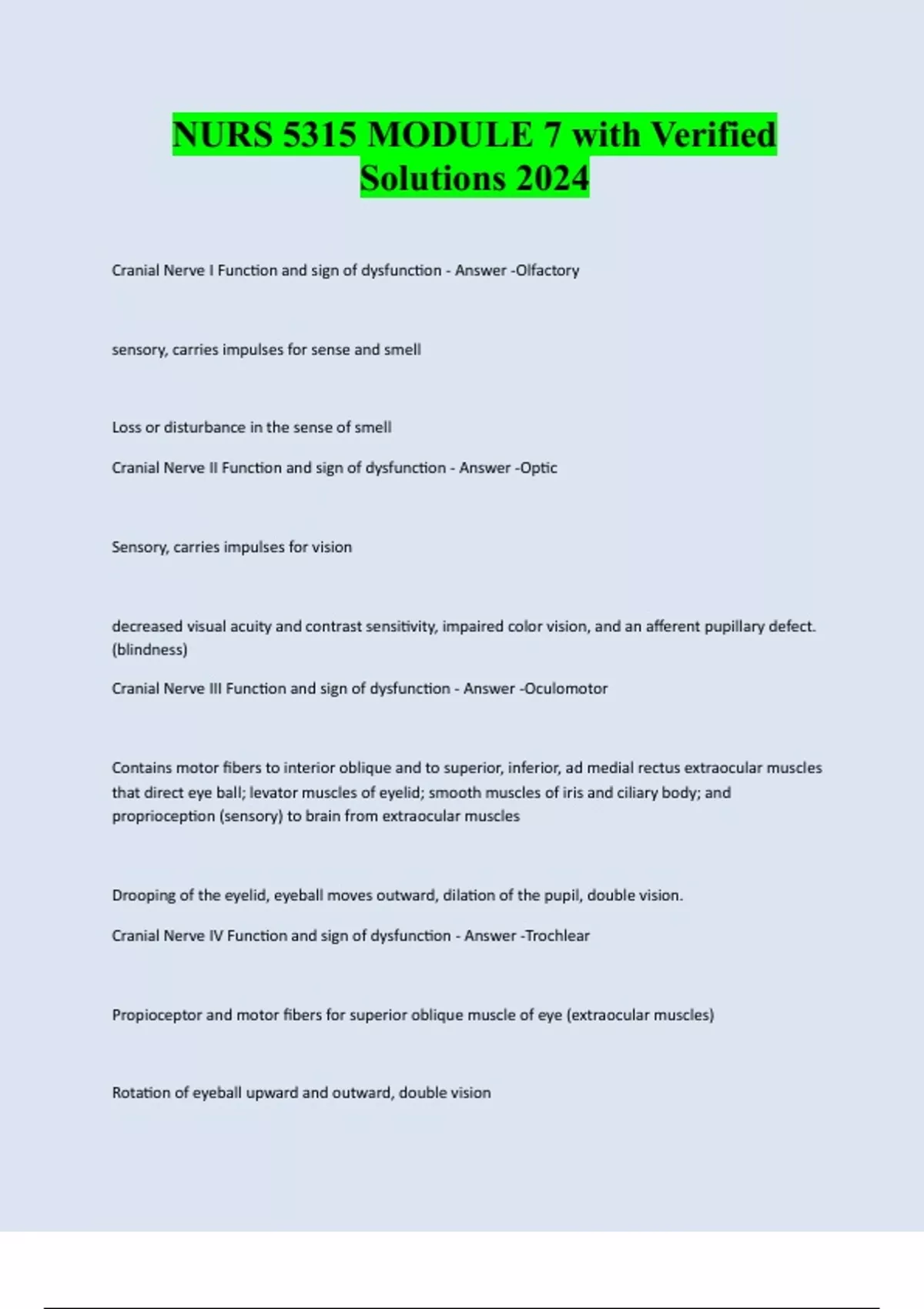 NURS 5315 MODULE 7 with Verified Solutions 2024 Cranial Nerve I Function and sign of dysfunction - Answer -Olfactory sensory, carries impulses for sense and smell Loss or disturbance in the sense of smell Cranial Nerve II Function and sign of dysfunction - Answer -Optic Sensory, carries impulses for vision decreased visual acuity and contrast sensitivity, impaired color vision, and an afferent pupillary defect. (blindness) Cranial Nerve III Function and sign of dysfunction - Answer -Oculomotor Contains motor fibers to interior oblique and to superior, inferior, ad medial rectus extraocular muscles that direct eye ball; levator muscles of eyelid; smooth muscles of iris and ciliary body; and proprioception (sensory) to brain from extraocular muscles Drooping of the eyelid, eyeball moves outward, dilation of the pupil, double vision. Cranial Nerve IV Function and sign of dysfunction - Answer -Trochlear Propioceptor and motor fibers for superior oblique muscle of eye (extraocular muscles) Rotation of eyeball upward and outward, double visionCranial Nerve V Function and sign of dysfunction - Answer -Trigenimal (facial muscles including chewing, facial sensation) This is the largest cranial nerve Both motor and sensory for face; conducts sensory impulses from mouth, nose, surface of eye, and dura mater; also contains motor fibers that stimulate chewing muscles Sensory root - Pain or loss of sensation in the face, forehead, temple an