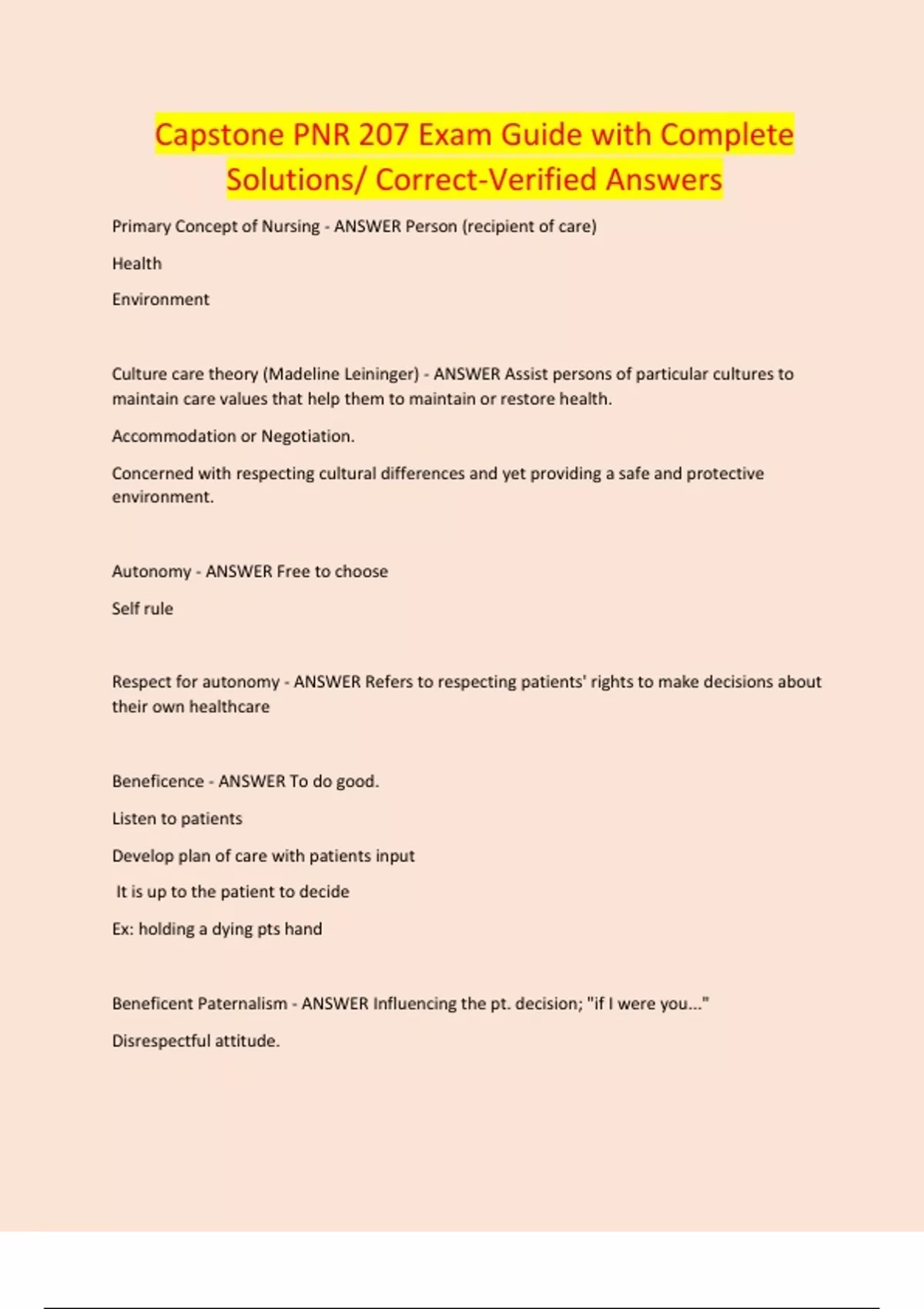 Capstone PNR 207 Exam Guide with Complete Solutions/ Correct-Verified Answers