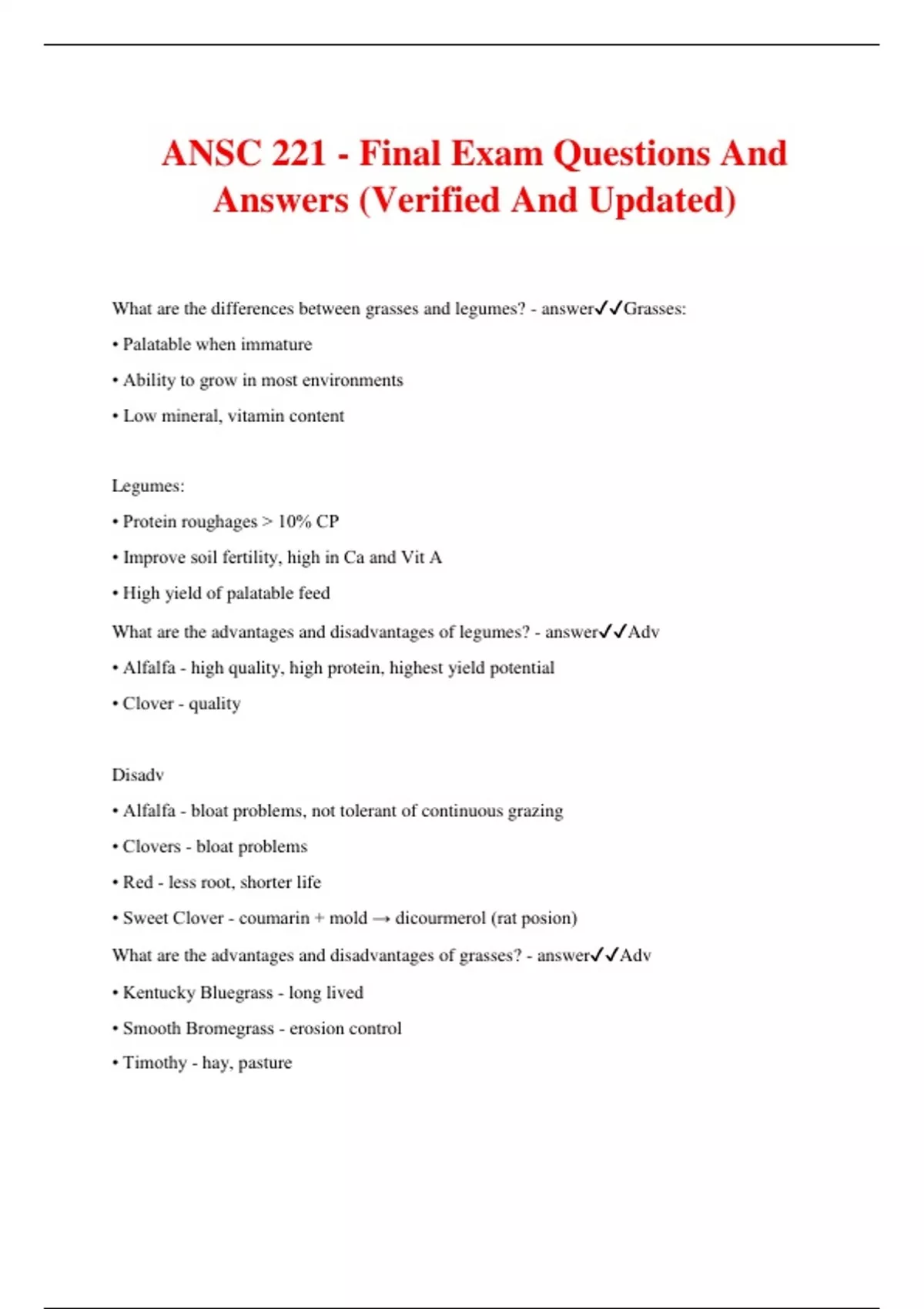 ANSC 221 - Final Exam Questions And Answers (Verified And Updated) What are the differences between grasses and legumes? - answerGrasses: • Palatable when immature • Ability to grow in most environments • Low mineral, vitamin content Legumes: • Protein roughages > 10% CP • Improve soil fertility, high in Ca and Vit A • High yield of palatable feed What are the advantages and disadvantages of legumes? - answerAdv • Alfalfa - high quality, high protein, highest yield potential • Clover - quality Disadv • Alfalfa - bloat problems, not tolerant of continuous grazing • Clovers - bloat problems • Red - less root, shorter life • Sweet Clover - coumarin + mold → dicourmerol (rat posion) What are the advantages and disadvantages of grasses? - answerAdv • Kentucky Bluegrass - long lived • Smooth Bromegrass - erosion control • Timothy - hay, pasture Disadv • Orchardgrass - palatability declines as it matures, deterrent to bloat What are the common grass forages? - answerBig bluestem Indian grass Switch grass Timothy Kentucky Bluegrass Fescue Orchardgrass What are the common legume forages? - answerAlfalfa Red Clover White Dutch Clover Alsike Clover Ladino Clover Soybeans Crownvetch Hairy Vetch Birdsfood Trefoil Sweet Clover What are the characteristics of pastures? - answer1. Fresh forage 2. Made for grazing 3. Has endurance 4. Can withstand trampling 5. Mix of plants What are the characteristics of silages? - answer1. Preserves crops due to fermentation 2. Proper moisture 3. Feeds more per acre 4. High quality feed