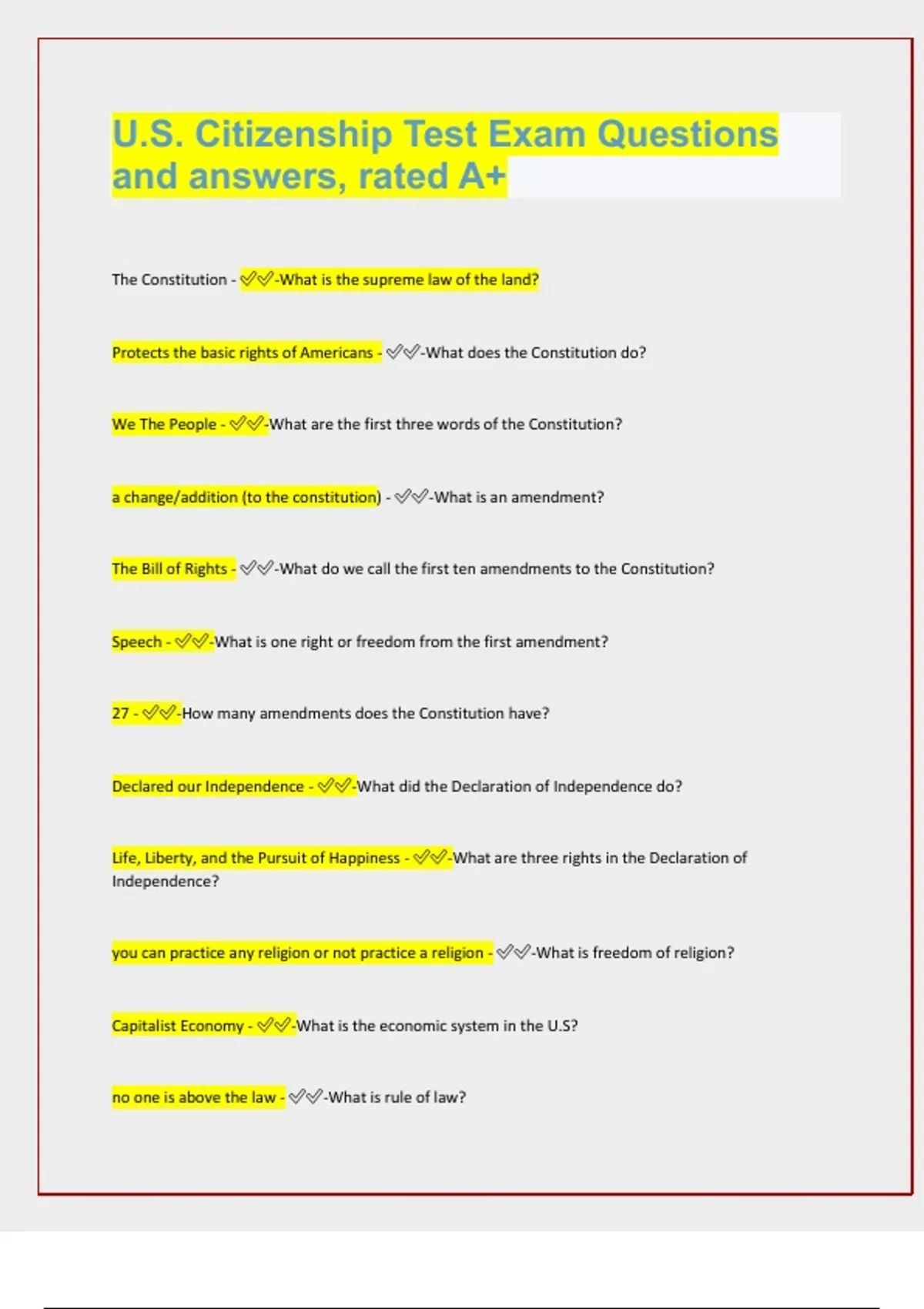 U.S. Citizenship Test Exam Questions and answers, rated A+ The Constitution - -What is the supreme law of the land? Protects the basic rights of Americans - -What does the Constitution do? We The People - -What are the first three words of the Constitution? a change/addition (to the constitution) - -What is an amendment? The Bill of Rights - -What do we call the first ten amendments to the Constitution? Speech - -What is one right or freedom from the first amendment? 27 - -How many amendments does the Constitution have? Declared our Independence - -What did the Declaration of Independence do? Life, Liberty, and the Pursuit of Happiness - -What are three rights in the Declaration of Independence? you can practice any religion or not practice a religion - -What is freedom of religion? Capitalist Economy - -What is the economic system in the U.S? no one is above the law - -What is rule of law? congress, legislative, president, executive, the court, or judicial - -Name one branch or part of government. Seperation of Powers or Checks and Balances - -What stops one branch of government from becoming too powerful