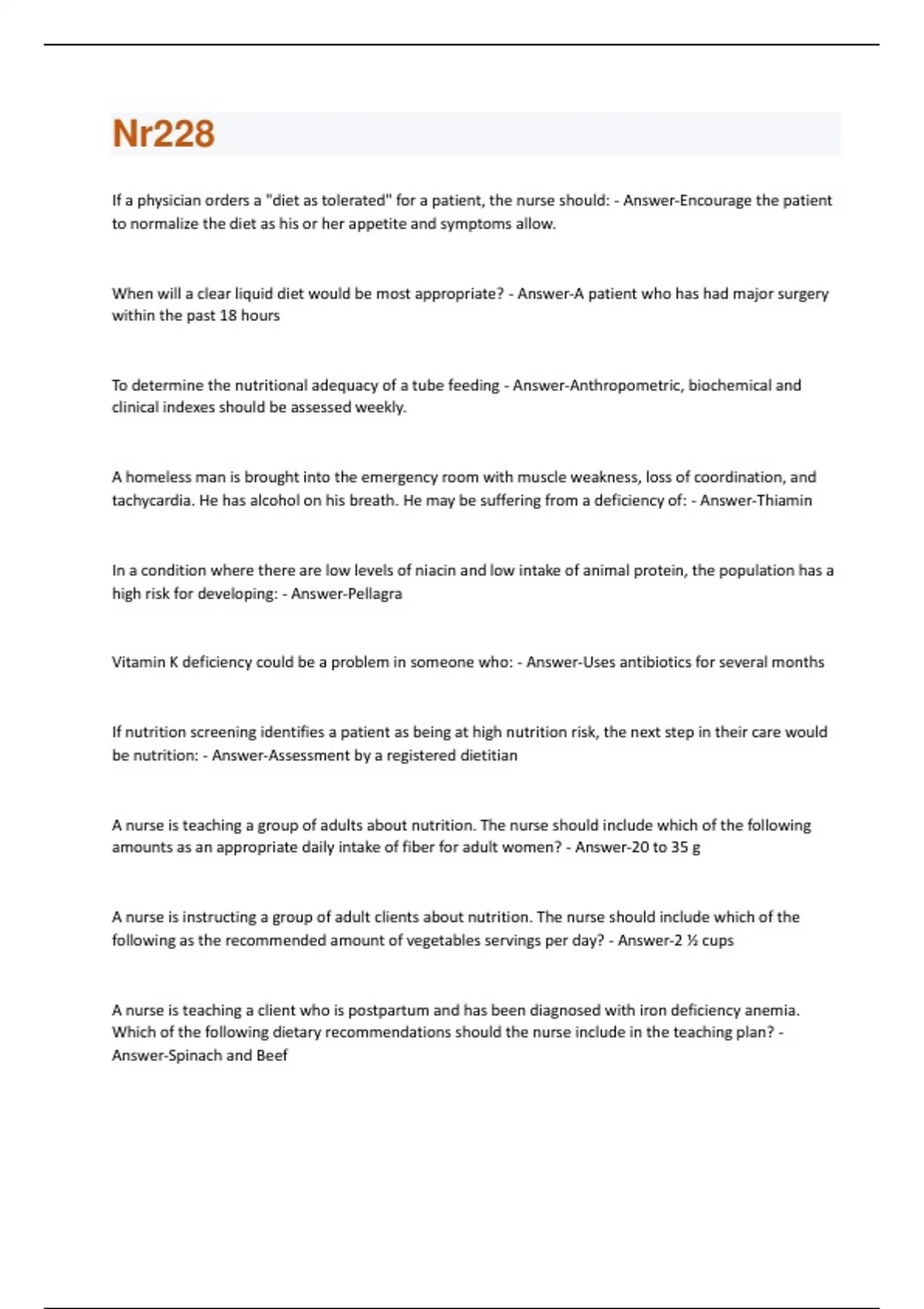 If a physician orders a "diet as tolerated" for a patient, the nurse should: - Answer-Encourage the patient to normalize the diet as his or her appetite and symptoms allow. When will a clear liquid diet would be most appropriate? - Answer-A patient who has had major surgery within the past 18 hours To determine the nutritional adequacy of a tube feeding - Answer-Anthropometric, biochemical and clinical indexes should be assessed weekly. A homeless man is brought into the emergency room with muscle weakness, loss of coordination, and tachycardia. He has alcohol on his breath. He may be suffering from a deficiency of: - Answer-Thiamin In a condition where there are low levels of niacin and low intake of animal protein, the population has a high risk for developing: - Answer-Pellagra Vitamin K deficiency could be a problem in someone who: - Answer-Uses antibiotics for several months If nutrition screening identifies a patient as being at high nutrition risk, the next step in their care would be nutrition: - Answer-Assessment by a registered dietitian A nurse is teaching a group of adults about nutrition. The nurse should include which of the following amounts as an appropriate daily intake of fiber for adult women? - Answer-20 to 35 g A nurse is instructing a group of adult clients about nutrition. The nurse should include which of the following as the recommended amount of vegetables servings per day? - Answer-2 ½ cups A nurse is teaching a client who is postpartum and has been diagnosed with iron deficiency anemia. Which of the following dietary recommendations should the nurse include in the teaching plan? - Answer-Spinach and BeefA nurse working for a home health agency is assessing an older adult client. Which of the following findings is the priority for the nurse to address? - Answer-Dysphagia A nurse is teaching a client who has constipation. Which of the following should the nurse discuss as causes of constipation? (Select all that apply) - Answer-Excessive laxative use/Ignoring the urge to defecate/Inadequate fluid intake A nurse is developing a plan of care for a client who practices Islam. Which of the following actions should the nurse include in the plan? - Answer-Request a meal tray without pork. A nurse notices an assistive personnel (AP) preparing to deliver a food tray to a client who practices the Orthodox Jewish faith. On the tray is a roast beef dinner with nonfat milk. Which of the following actions should the nurse take? - Answer-Call the dietary department and ask for a kosher tray. A BMI of 18 would reflect a. underweight. b. normal weight. c. overweight. d. severe overweight. - Answer-underweight A nurse is caring for a child who has acute gastroenteritis but is able to tolerate oral fluids. The nurse should anticipate providing which of the following types of fluid? - Answer-Oral rehydration solution A nurse is caring for a client who is receiving a mechanically altered diet. Which of the following client food choices necessitates intervention by the nurse? - Answer-Piece of wheat toastA nurse is caring for a client who has bilateral eye patches in place following an injury. When the client's food tray arrives, which of the following interventions should the nurse take to promote independence in eating? - Answer-Describe to the client the location of the food on the tray Healthy People 2020 focuses on the ultimate vision of: - Answer-A society in which all people live long, healthy lives The most important and unique role of dietary protein is to: - Answer-Build tissue The DRIs serve as a useful overall guide for promoting dietary and lifestyle choices for all people throughout life by recommending: - Answer-Ideal intakes for each nutrient according to age and gender Margaret has been reading information from the Internet regarding the health benefits of coconut oil in the diet. It is important for Margaret to know that coconut oil contains what type of fat? - AnswerSaturated The best menu choice for a patient with a severe wound who needs adequate vitamin C to help promote healing would be: - Answer-Stuffed green pepper Megaloblastic anemia is associated with: - Answer-Folate deficiency It would be beneficial for a 65-year-old woman to consume foods with calcium such as: - Answer-Yogurt The easiest way to measure fluid loss during a day of hard work in a hot climate is to: - Answer-Measure body weight at the beginning and at the end of the day A nurse is instructing a group of clients about nutrition. The nurse should include that which of the following is a trigger for the formation of vitamin D in the body? - Answer-Exposure to sunlight A nurse is caring for a client who is well-hydrated and who demonstrates no evidence of anemia. Which of the following laboratory values gives an assessment of the adequacy of the client's protein uptake and synthesis? - Answer-AlbuminA nurse is teaching a client who has gastroesophageal reflux disease about managing his illness. Which of the following recommendations should the nurse include in the teaching? - Answer-Avoid eating within 3 hours of bedtime A mother and grandmother bring a 2-month-old infant to the clinic for a routine checkup. As the nurse weighs the infant, the grandmother asks, "Shouldn't the baby start eating solid food? My kids started on cereal when they were 2 weeks old." Which response by the nurse would be most appropriate? - Answer-Babies can't digest solid food properly until they are 4 months old The nurse is providing nutrition counseling for an obese adolescent. What is the most effective way for the nurse to obtain a nutrition history from this client? - Answer-Ask her what she ate yesterday if it was a typical day Caregivers of an infant with a feeding button style gastrostomy tube mention to the nurse there is leaking present. What action should the nurse take? - Answer-Assess if the leakage is coming from valve failure or from the peristomal area.