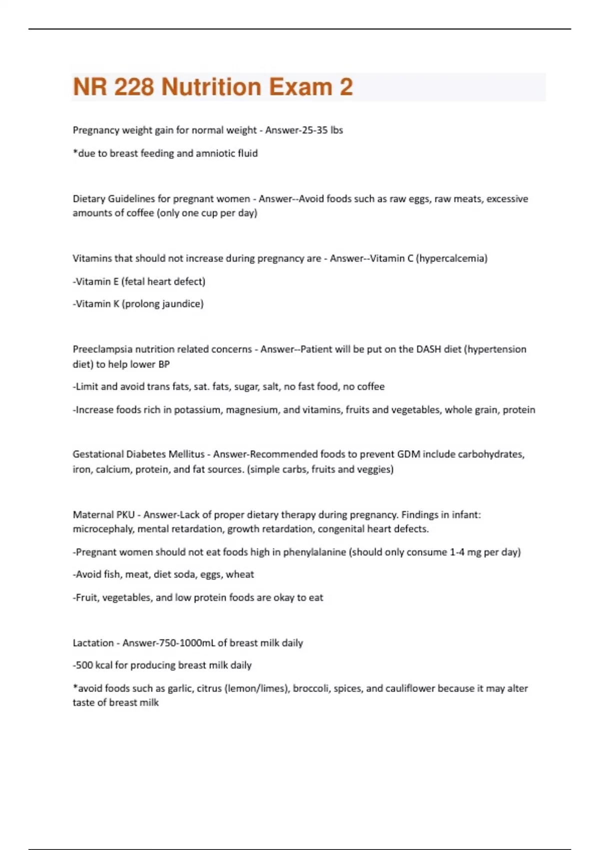 Pregnancy weight gain for normal weight - Answer-25-35 lbs *due to breast feeding and amniotic fluid Dietary Guidelines for pregnant women - Answer--Avoid foods such as raw eggs, raw meats, excessive amounts of coffee (only one cup per day) Vitamins that should not increase during pregnancy are - Answer--Vitamin C (hypercalcemia) -Vitamin E (fetal heart defect) -Vitamin K (prolong jaundice) Preeclampsia nutrition related concerns - Answer--Patient will be put on the DASH diet (hypertension diet) to help lower BP -Limit and avoid trans fats, sat. fats, sugar, salt, no fast food, no coffee -Increase foods rich in potassium, magnesium, and vitamins, fruits and vegetables, whole grain, protein Gestational Diabetes Mellitus - Answer-Recommended foods to prevent GDM include carbohydrates, iron, calcium, protein, and fat sources. (simple carbs, fruits and veggies) Maternal PKU - Answer-Lack of proper dietary therapy during pregnancy. Findings in infant: microcephaly, mental retardation, growth retardation, congenital heart defects. -Pregnant women should not eat foods high in phenylalanine (should only consume 1-4 mg per day) -Avoid fish, meat, diet soda, eggs, wheat -Fruit, vegetables, and low protein foods are okay to eat Lactation - Answer-750-1000mL of breast milk daily -500 kcal for producing breast milk daily *avoid foods such as garlic, citrus (lemon/limes), broccoli, spices, and cauliflower because it may alter taste of breast milkInfancy birth weight and breast feeding - Answer--first 6 months of life infant should consume breast milk. -second 6 months of life infant should consume a combination of breast milk and baby food Infant Dietary Guidelines - Answer--Solid foods at 4-5 months -if exclusively breastfeeding, baby should be taking in an iron supplement at 4 months old to avoid iron deficiency anemia. Infancy and Fat Consumption - Answer--Fat and cholesterol consumption is important in brain growth and development and nerve tissue -If infant is overweight, do not restrict fats Baby Bottle Tooth Decay - Answer-occurs when baby goes to bed with a bottle -bottle before bed should only contain water Nutrition-Related Concerns: Infancy - Answer--Premature/low-weight = failure to thrive -if child has PKU, phenyl-free formula should be used -If baby has galactosemia (lactose intolerant) baby should consume soy formula Toddlers: 1-3 years old diet - Answer--limit 100% juice: 4-6oz per day -consume snack foods such as graham crackers, apple slices, and cheese cubes -Limit milk intake to 24oz per day due to lack of iron -child should try food product 7-10 times before deciding not to like something Preschoolers: 4-6 years old diet - Answer--environmental influencer eaters -avoid eating sugary foods while watching tv -healthy plate contains: veggies, fruits, whole grain, healthy protein, water, healthy oilsSchool age children: 7-12 years old diet - Answer--Concerns are: 10% skipping breakfast and type of diet they are consuming -Risk for diabetes and obesity Adolescence: 13-19 years old diet - Answer-- iron, fiber, calcium, protein, and vitamins are important nutrients to consume -Calcium intake = 1300 mg daily (3 to 4 servings of dairy products) -Adolescents reach maximum bone density levels during this time -Foods high in CA: milk, sardines, cheese, yogurt