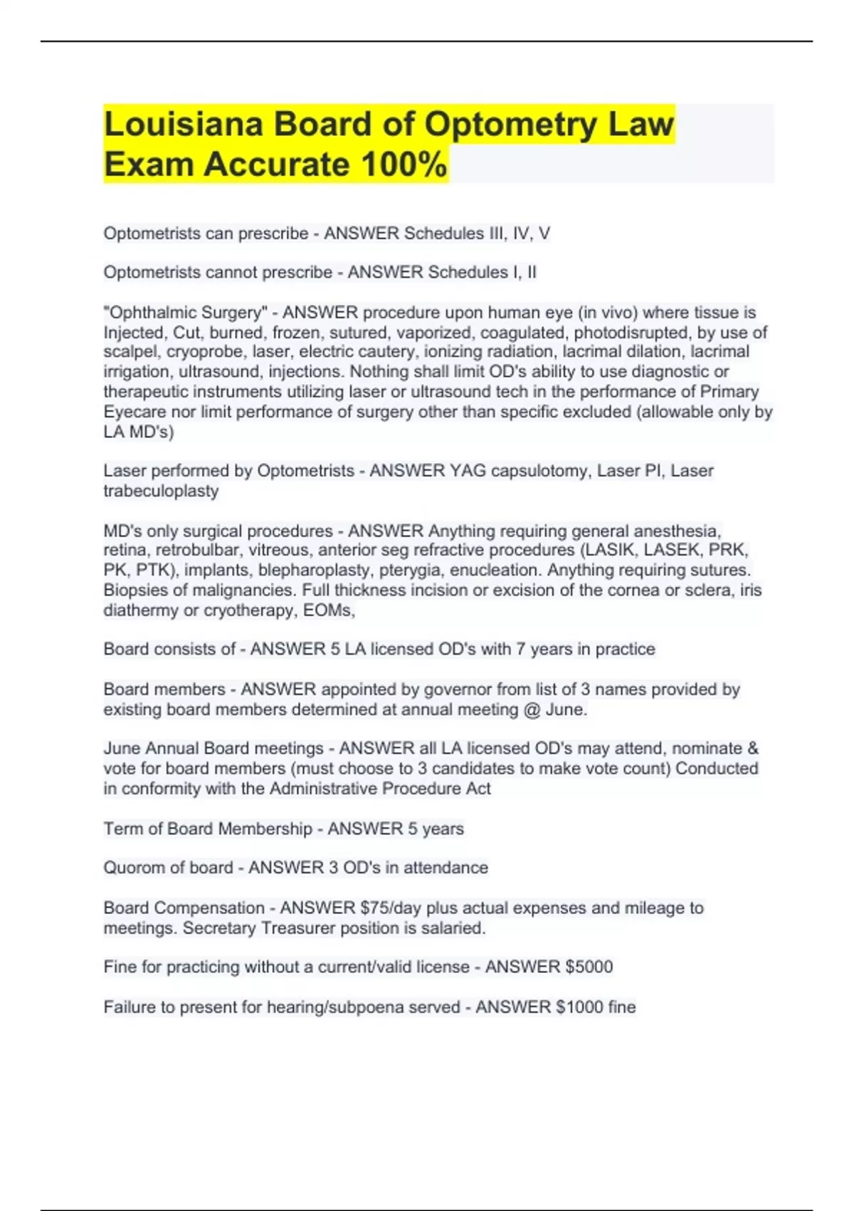 Louisiana Board of Optometry Law Exam Accurate 100%