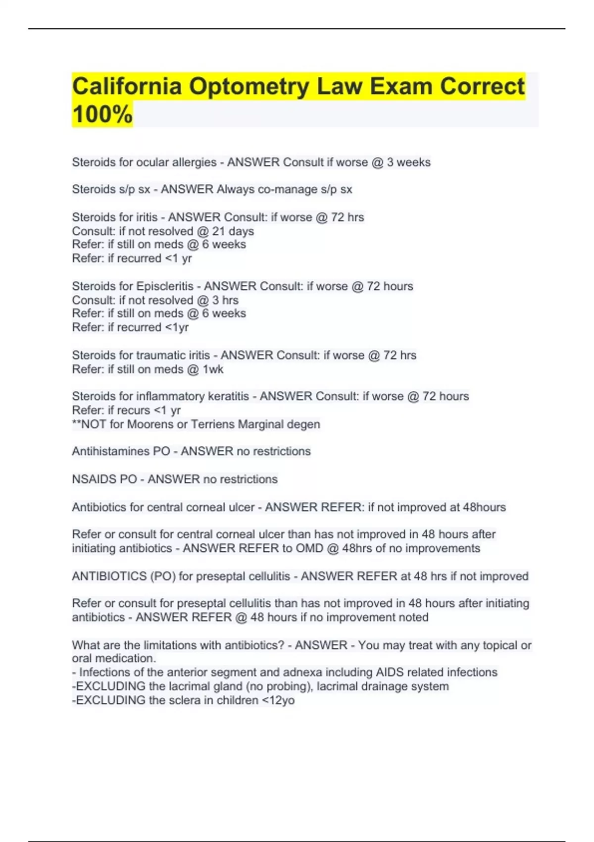 Steroids for ocular allergies - ANSWER Consult if worse @ 3 weeks Steroids s/p sx - ANSWER Always co-manage s/p sx Steroids for iritis - ANSWER Consult: if worse @ 72 hrs Consult: if not resolved @ 21 days Refer: if still on meds @ 6 weeks Refer: if recurred <1 yr Steroids for Episcleritis - ANSWER Consult: if worse @ 72 hours Consult: if not resolved @ 3 hrs Refer: if still on meds @ 6 weeks Refer: if recurred <1yr Steroids for traumatic iritis - ANSWER Consult: if worse @ 72 hrs Refer: if still on meds @ 1wk Steroids for inflammatory keratitis - ANSWER Consult: if worse @ 72 hours Refer: if recurs <1 yr **NOT for Moorens or Terriens Marginal degen
