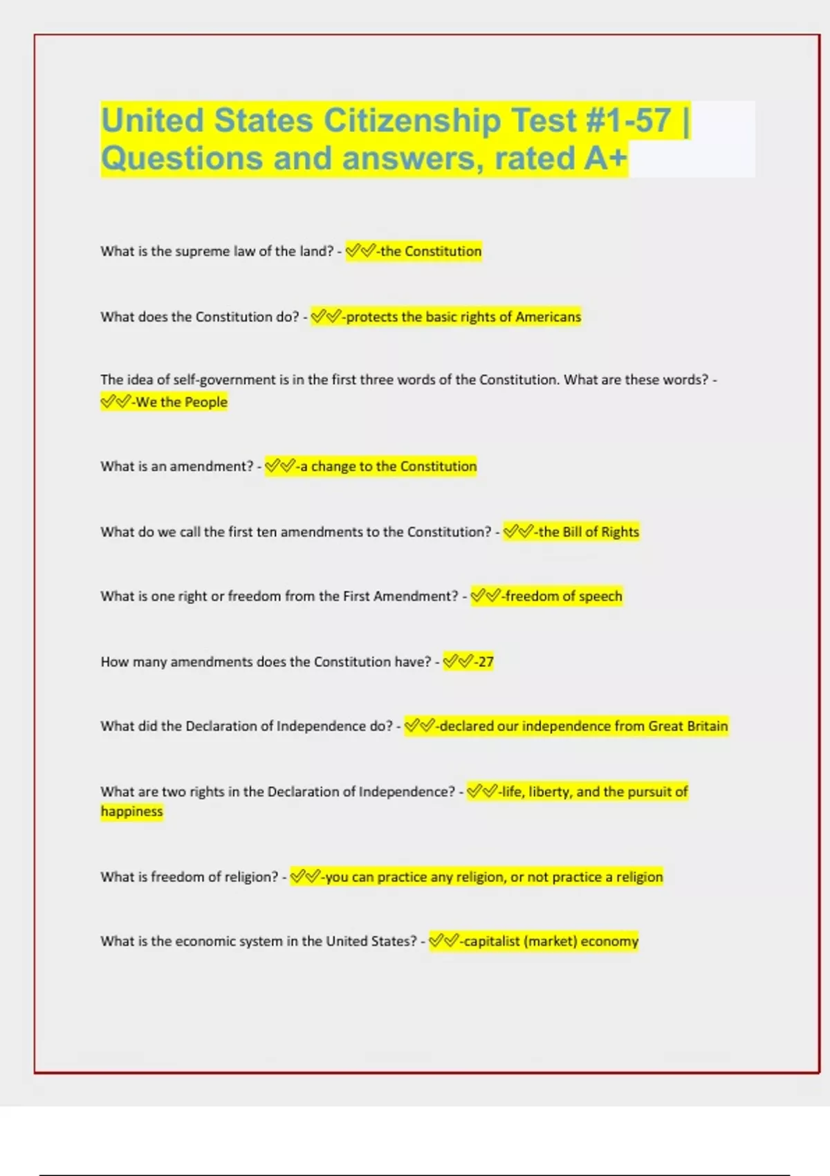 United States Citizenship Test #1-57 | Questions and answers, rated A+ What is the supreme law of the land? - -the Constitution What does the Constitution do? - -protects the basic rights of Americans The idea of self-government is in the first three words of the Constitution. What are these words? - -We the People What is an amendment? - -a change to the Constitution What do we call the first ten amendments to the Constitution? - -the Bill of Rights What is one right or freedom from the First Amendment? - -freedom of speech How many amendments does the Constitution have? - -27 What did the Declaration of Independence do? - -declared our independence from Great Britain What are two rights in the Declaration of Independence? - -life, liberty, and the pursuit of happiness What is freedom of religion? - -you can practice any religion, or not practice a religion What is the economic system in the United States? - -capitalist (market) economy What is the "rule of law"? - -no one is above the law, all must obey the law Name one branch or part of the government. - -legislative, executive, or judicial What stops one branch of government from becoming too powerful? - -checks and balances separation of powers Who is in charge of the executive branch? - -the President Who makes federal laws? - -Congress What are the two parts of the U.S. Congress? - -the Senate and the House of Representatives How many U.S. Senators are there? - -100 We elect a U.S. Senator for how many years? - -6 Who is one of your state's U.S. Senators now? - -Elizabeth Warren & Ed Markey The House of Representatives has how many voting members? - -435 We elect a U.S. Representative for how many years? - -2 Name your U.S. Representative. - -Stephen Lynch Who does a U.S. Senator represent? - -all people of the st